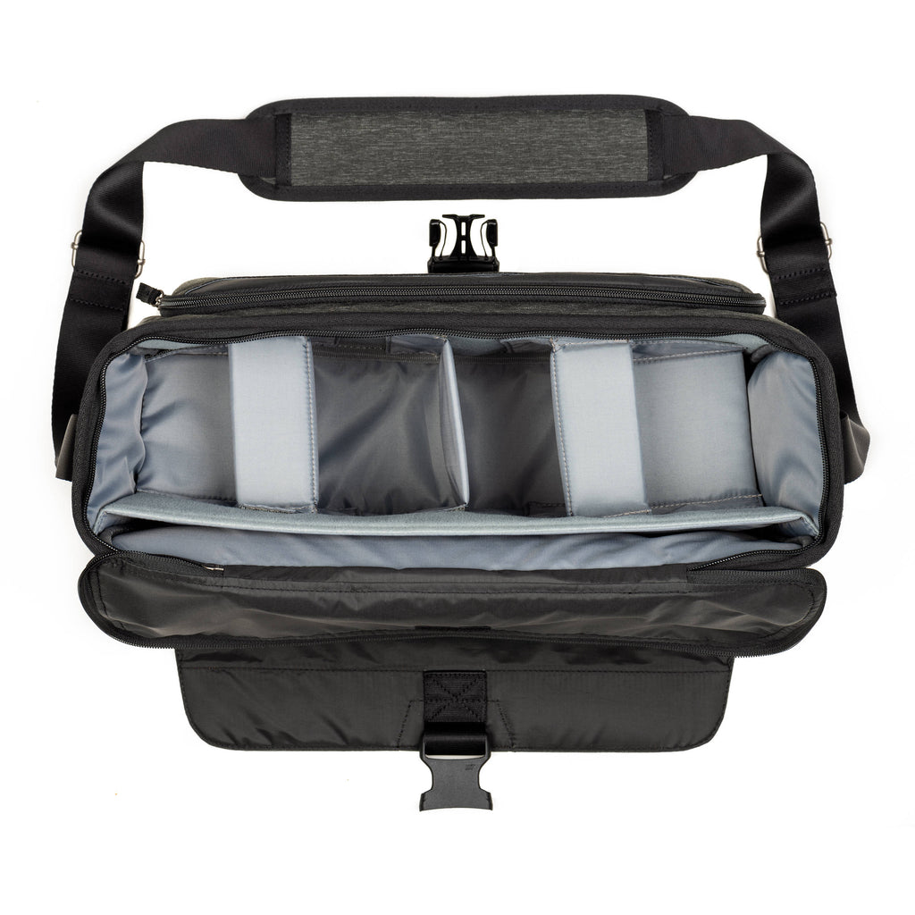 This graphite-colored, Vision 15 Shoulder Bag from Think Tank is a versatile, messenger-style camera bag that can accommodate a medium-sized DSLR with up to three to five lenses, including an attached 24-70mm f/2.8 lens, as well as a detached 70-200mm f/2.8 lens, plus an on-camera flash. Within the Vision 15's main compartment, which includes a pocket for a 15" laptop, three padded, adjustable dividers can be configured according to the specific camera equipment being carried. Unlike many camera bags of its kind, the Vision 15's main compartment features its own zippered lid for use under the bag's front flap, enhancing security and protection from the elements.