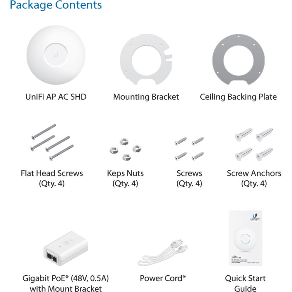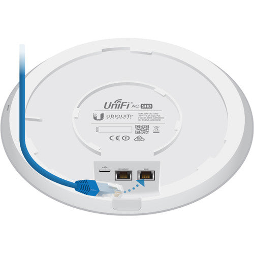 Expand your wireless network with the UAP-AC-SHD 802.11AC Wave 2 Access Point with Dedicated Security Radio from Ubiquiti Networks . This wireless access point supports 802.11a/g/b/n/ac-wave2 Wi-Fi standards and operates on both the 2.4 GHz and 5 GHz frequencies. In addition to enhanced Wi-Fi support, this AP also comes equipped with dual Gigabit Ethernet PoE compliant ports featuring 802.3at PoE+ compatibility.