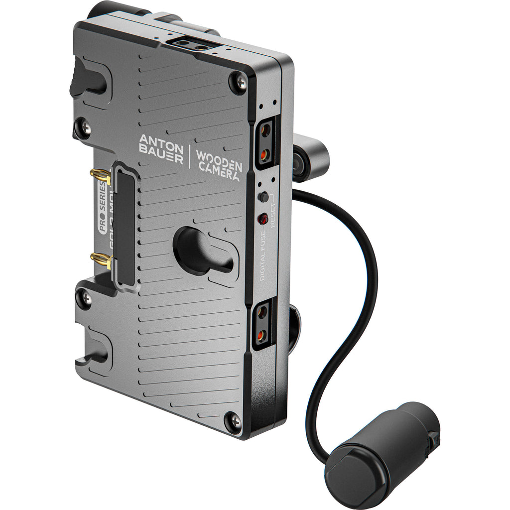 The slide mounts a single Gold mount battery and powers the camera using a 4-pin XLR cable, which also provides hot-swap capability with the camera's internal battery. There are three D-Tap outputs around the battery plate to power a variety of other accessories.