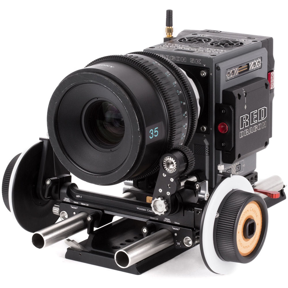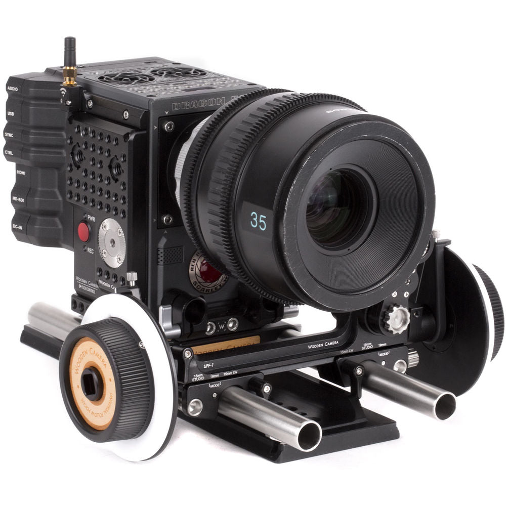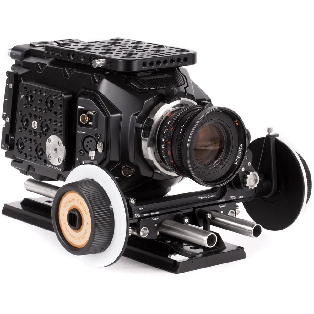Wooden Camera 's UFF-1 Universal Follow Focus is designed to fit on any of the three major rod standards, 15mm LWS, 15mm studio, and 19mm studio without rod adapters. The UFF-1 achieves this through movable rod clamps that lock into marked positions along the follow focus' bridge. The swinging arm allows lenses of multiple sizes to be used, and provides extra reach for using with the studio rod standards. Drive gears can be mounted to either side of the arm, and the arm itself can be mounted to either side of the gear drive.