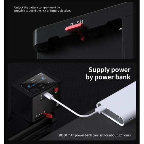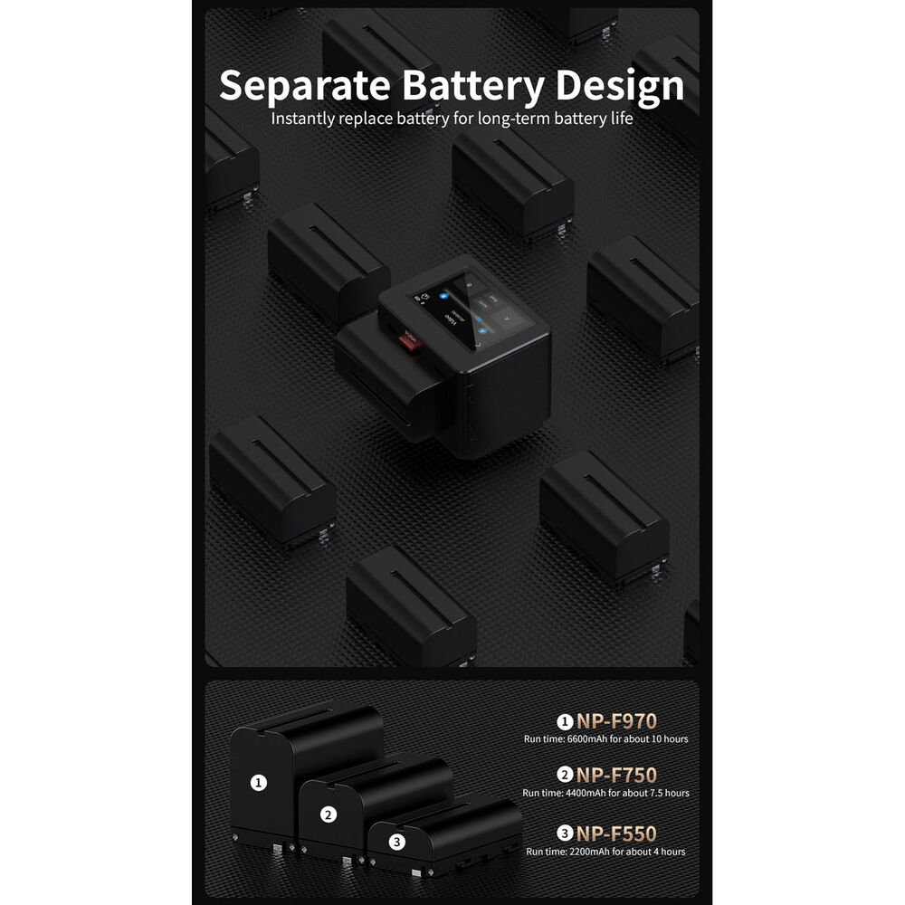 - Compatible with Sony NP-F series batteries or 10000mAh power bank via USB Type-C input
