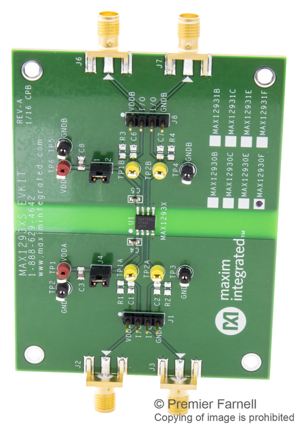 The MAX12930FEVKIT# is an evaluation kit (EV kit) for MAX12930. It provides a proven design to evaluate the MAX12930 dual channel digital isolator. The EV kit should be powered from two independent isolated power supplies with nominal output voltage in range from 1.71V to 5.5V. For evaluating the electrical parameters of the device without any isolation between the two sides, a single power supply can also be used. Typically used at battery management, fieldbus communications for industrial automation, general isolation application, isolated RS232, RS485/RS422, CAN and medical systems.