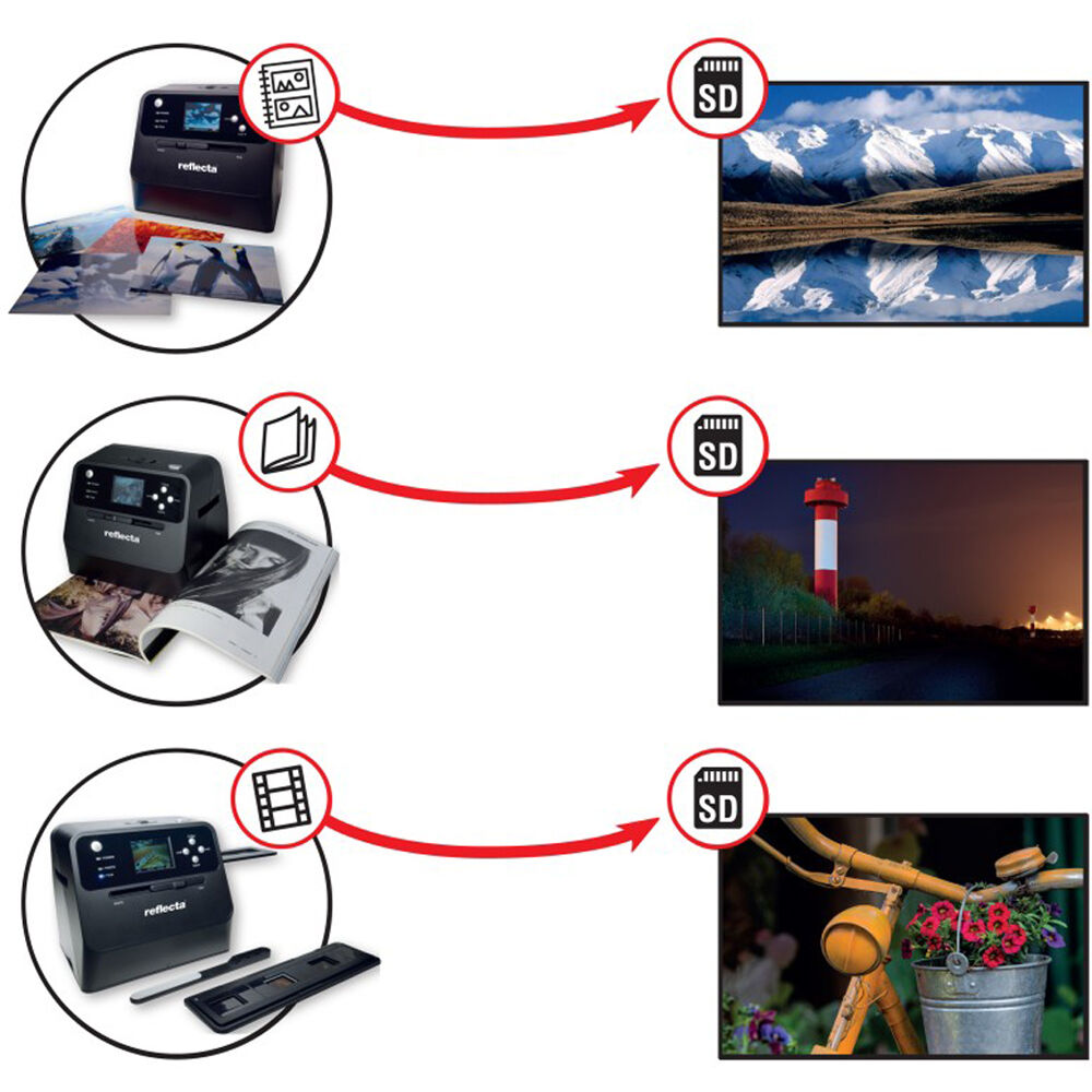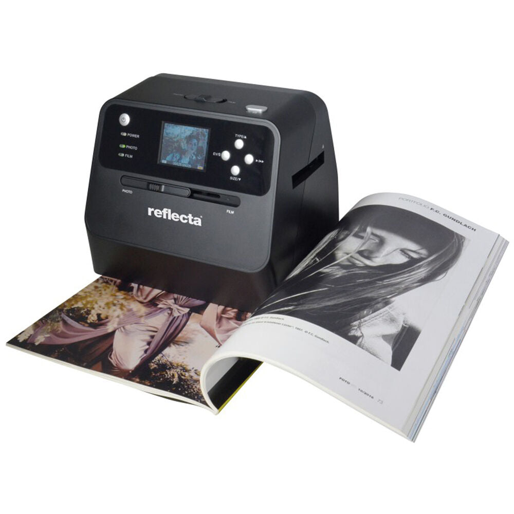 Digitize slides, negatives, and photos in an instant with the reflecta Combo Album Scan from Braun. Featuring a 14MP CMOS sensor, this easy-to-use scanner quickly delivers high resolution scans of 4416 x 2944 pixels. A 2.4" TFT LCD display provides a preview function for viewing and scanning, and the unit can digitize an image in less than two seconds. The reflecta Combo Album Scan directly saves scanned images as JPEG files and saves them to a separately purchased SD card, and this stand-alone device is completely independent of computers. A 35mm film holder is provided and holds up to six frames at a time, and a slide holder is also included, which is compatible with 35mm film slides. Additionally, the scanner features an open-bottom design and the integrated illumination can easily scan images from books or photo albums.
