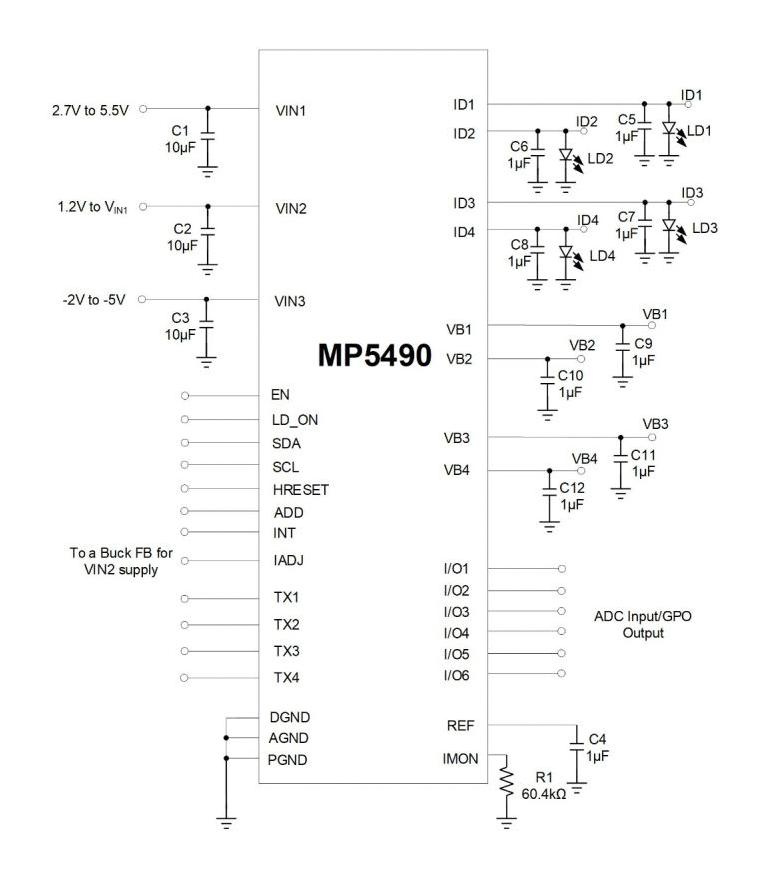 MP5490GC-0000-P is a complete power management solution that is well-suited for the transmitter optical subassembly (TOSA) of optical modules. The MP5490 integrates four high-accuracy current sources (IDx) for distributed feedback (DFB) laser diodes (LDs), and four negative voltage biases for an electro-absorption modulated laser (EML) bias. The MP5490 also provides 4-channel EML current measurements and monitoring photodetector (MPD) current measurements to simplify the design. The integrated 6 channels of high-accuracy and low temperature coefficient analogue-to-digital converters (ADCs) can be used to read the external current, voltage, and temperature to save microcontroller (MCU) resources. via All output rails can be adjusted via the I2C bus or preset the multi-page one-time programmable (MOTP) memory. The MP5490 requires a minimal number of external components, and is available in a space-saving WLCSP-36 (3mmx4.25mm) package.