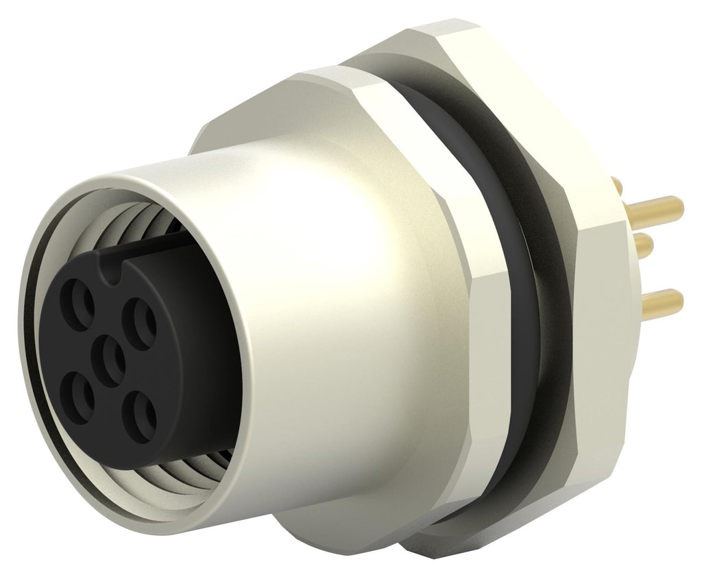 This is a Sensor Connector, M12, Receptacle, 5 Contacts, PCB Socket, Straight Panel Mount product from TE CONNECTIVITY with the model number T4143012051-000