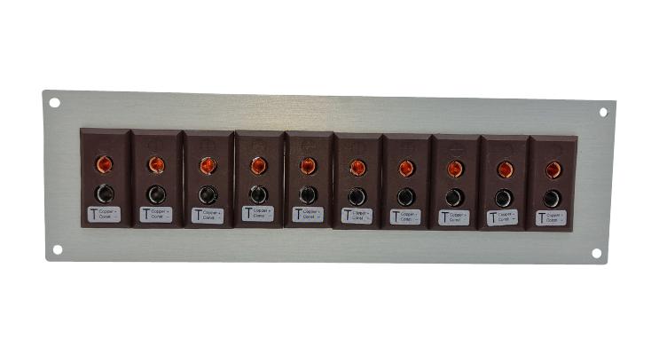 IS-T-FF + FSP-10 is a Type T IEC standard thermocouple panel system. It is designed for use with thermocouples or leads with standard plugs. It is robust and perfect for mounting in control rooms, test stands, laboratory applications, control rooms, and more. It supports calibration codes including K, J & T with quick wire sockets, with a maximum temperature range up to +120°C. This panel can be fitted horizontally or vertically.