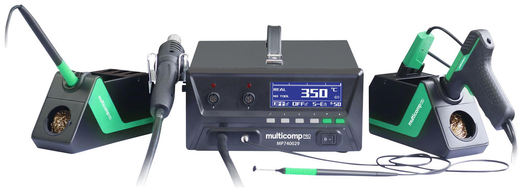 The Multicomp Pro MP740029 is a 4-in-1 rework station, including functionality for soldering, hot air, desoldering and electronic tweezers. This intuitive station has a high accuracy MCU control which synchronously detects whether the 3x tool channels can be used independently without manual interference.