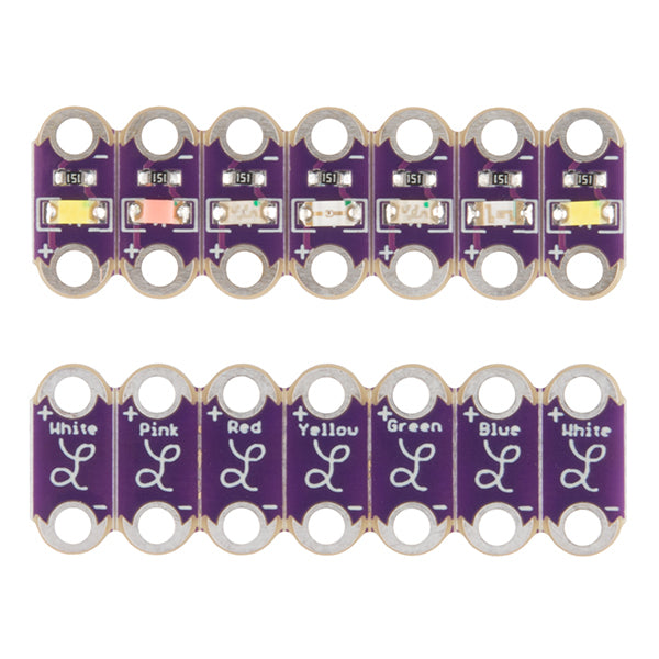 The LilyPad Rainbow LED features seven individual LEDs in six unique colors (Red, Blue, Green, Yellow, Pink, and White). Text has been added to the back of each board to indicate its color. Due to popular request, we have included two white LEDs instead of just one.