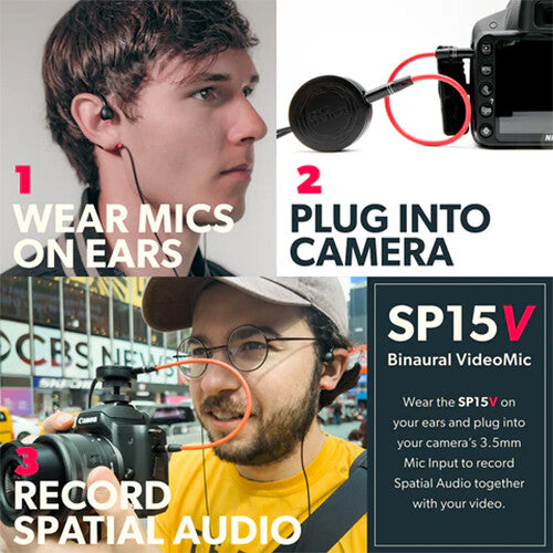 Record high-quality immersive stereo audio to your DSLR/mirrorless camera or portable audio recorder with the SonicPresence SP15V Spatial Microphone, a portable and relatively wallet-friendly device that captures audio just as your ears hear it. Wearing this mic as you would a pair of earbuds, you can walk around any location and record an immersive sonic capture directly to your camera or recorder.