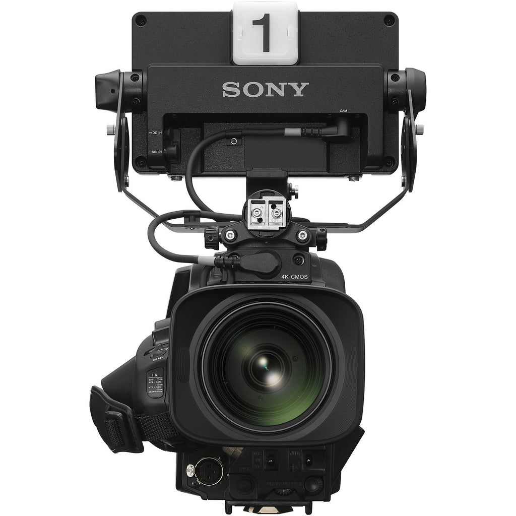 Sony incorporates a 2/3" 4K CMOS sensor for producing oversampled HD imaging or UHD 4K with a separately available license. This broadcast-style camera has a SMPTE LEMO connector for connecting to a separate HXCU-FZ90 CCU. This kit includes a 20x zoom lens and an HDVF-EL740 7.4" OLED viewfinder.