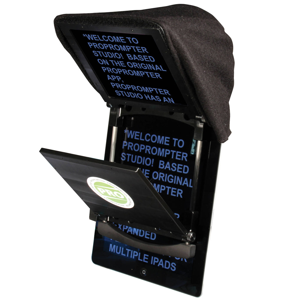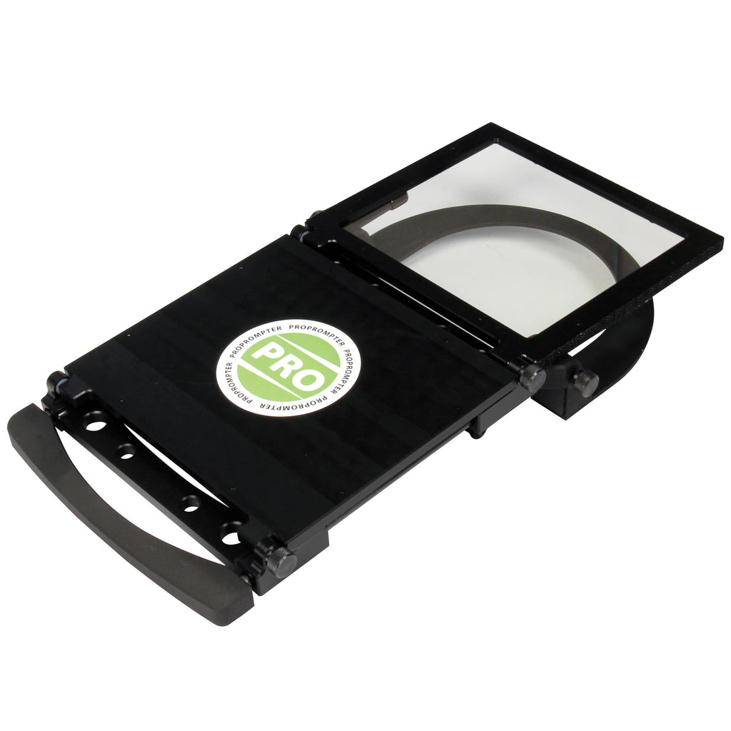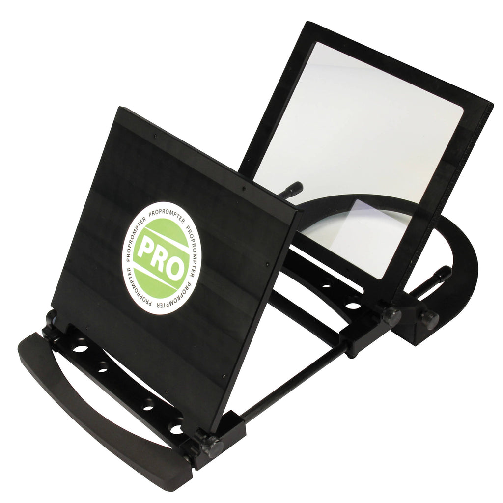 The ProPrompter Desktop is made from aircraft grade aluminum and carbon fiber to be light and durable, and folds flat for transport and storage. The unit works with a variety of optional prompting software, and comes with a black fabric hood.