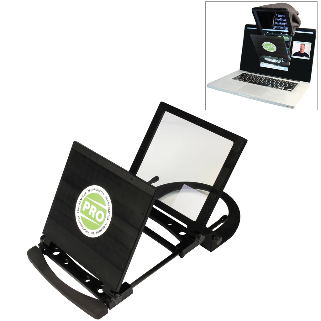 The ProPrompter Desktop from ProPrompter allows you to turn virtually any laptop, desktop, or iPad or tablet into a teleprompter by using your device's built-in webcam. If your device lacks a built-in webcam you can use an optional external center lens webcam or optional DSLR camera in place of the webcam. The prompter glass measures 4 x 5", and supports a 16:9 aspect ratio. Your webcam shoots through the units 70/30 partially mirrored glass, allowing your talent to be several feet away from the screen while recording.