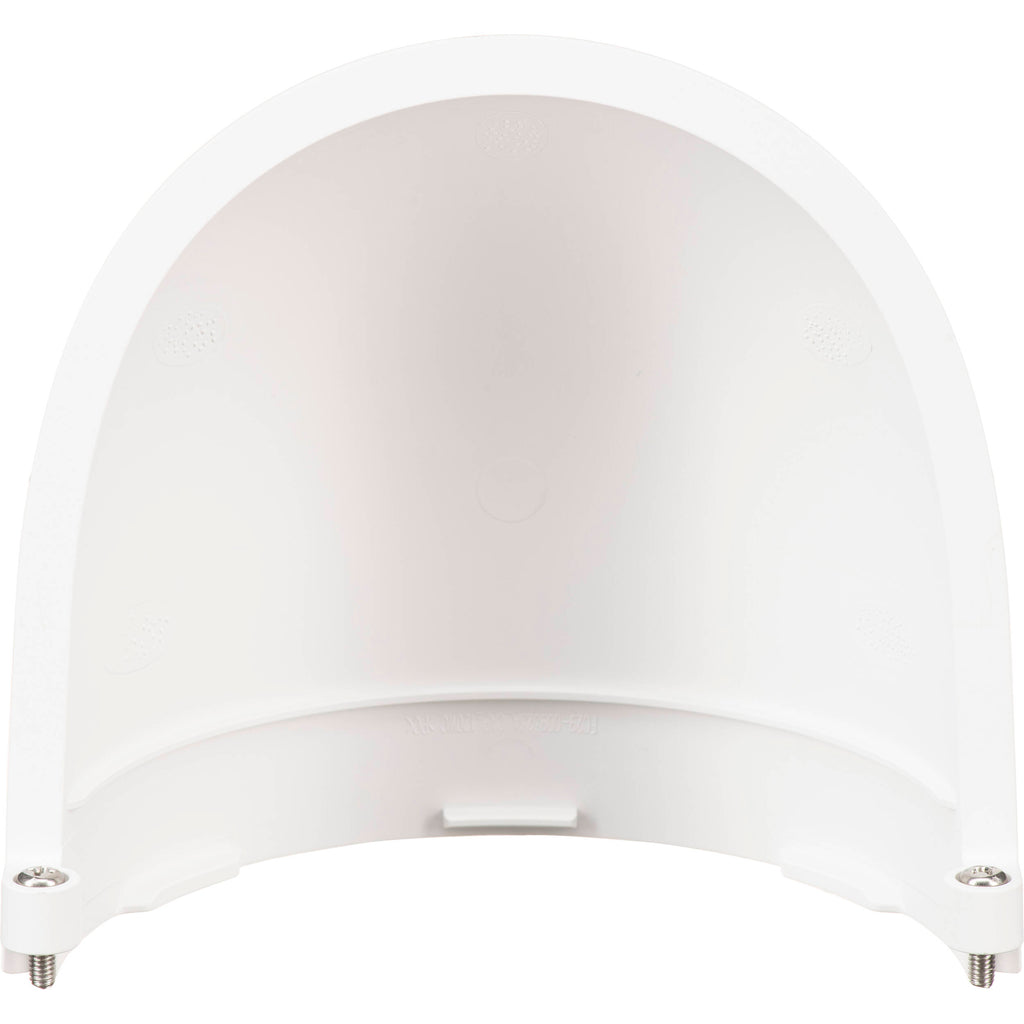 The white Hanwha Techwin SBV-120WCW is a weather cap designed for select Q series cameras. It shields the camera lens from sun glare and rain when wall mounted. Additionally, it prevents the buildup of snow and ice.
