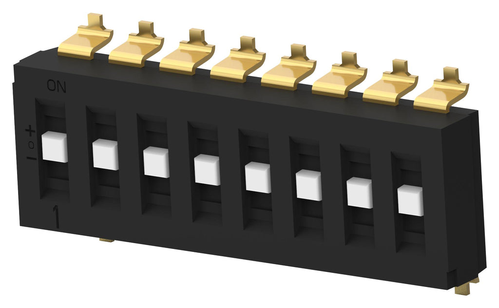 Alcoswitch - TE Connectivity TDS08SGRNTR04 DIP / SIP Switch Recessed Type 8 Circuits SP3T SMD TDS Series Unsealed 24 V