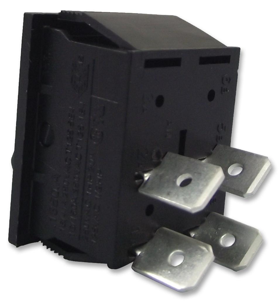The C1350AAAAA is a DPST black non-illuminated high inrush Panel-mount Rocker Switch with ON-OFF operation. Its mechanism ensures contact welds formed at switch-on are positively separated by the plunger tube acting directly on the step in the moving contact.
