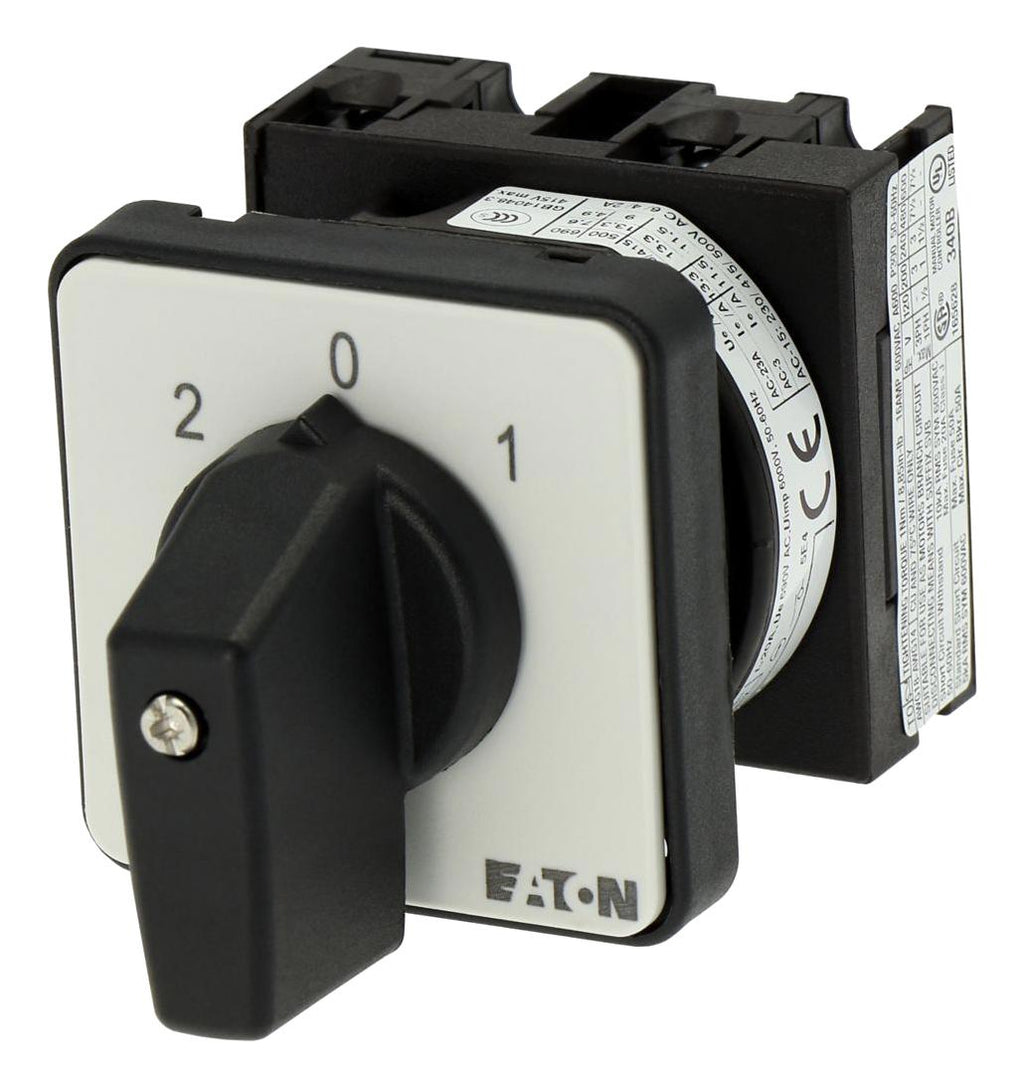 T0-1-15421/E is an Eaton Moeller® series T0 changeover switch. It includes short-circuit protection. Safety certification are IEC/EN 60947, UL File No.: E36332, CSA, IEC/EN 60947-3, CE, CSA Class No.: 3211-05, UL, CSA File No.: 012528, CSA-C22.2 No. 94, CSA-C22.2 No. 60947-4-1-14, VDE 0660, UL 60947-4-1, UL Category Control No.: NLRV, IEC/EN 60204.