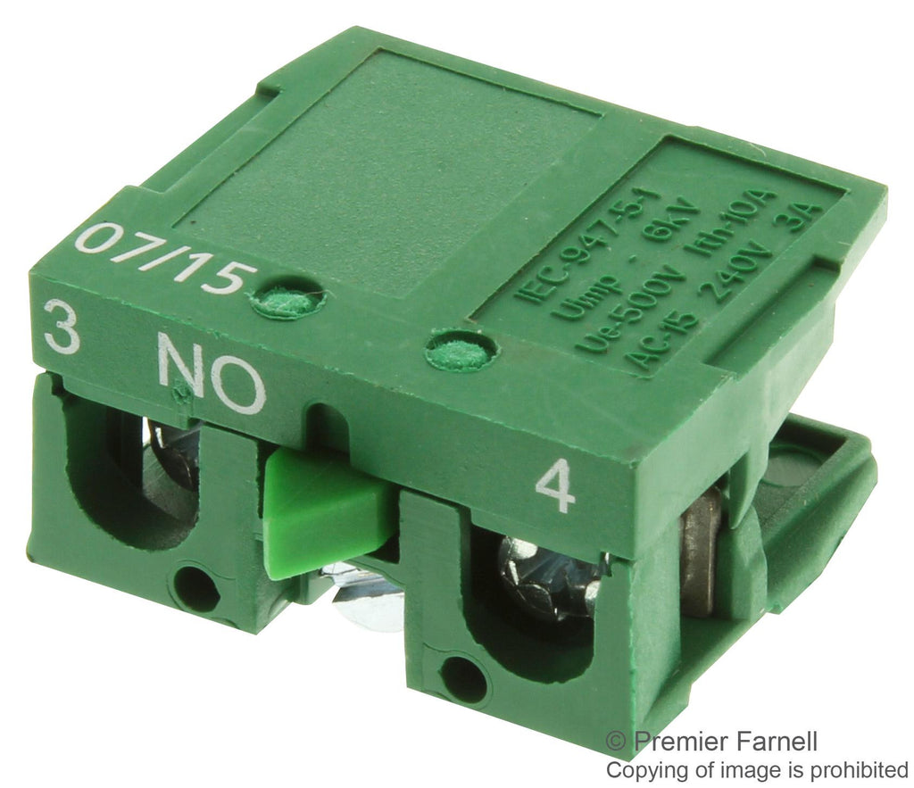 The RB2-BE101-BP is a 1-pole 1NO Auxiliary Contact Block, suitable for 22mm pushbutton switches with screw terminal.