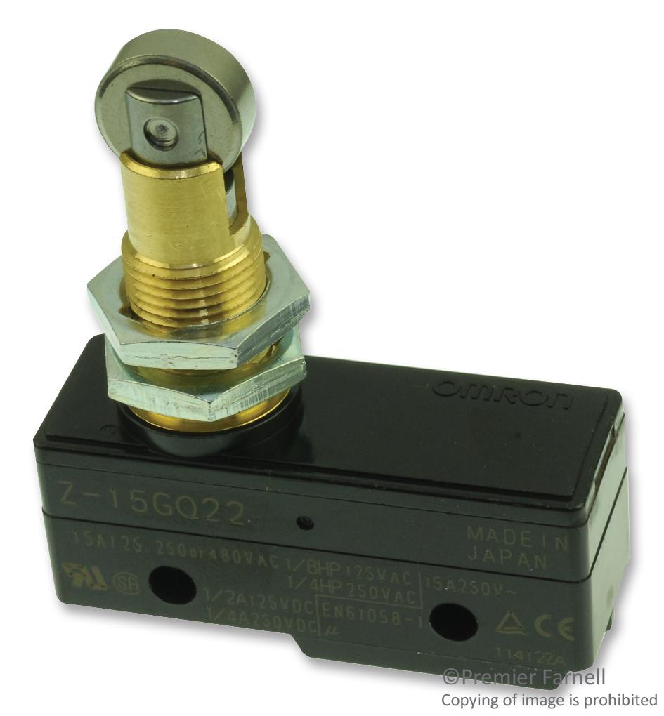 This is a MICRO SW, ROLLER PLUNGER, SPDT, 15A 250V product from OMRON INDUSTRIAL AUTOMATION with the model number Z-15GQ22