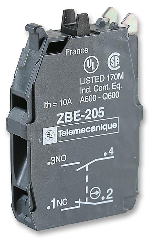 This is a Contact Block, 1NO/1NC, 10 A, 600 V, 1 Pole product from SCHNEIDER ELECTRIC / TELEMECANIQUE with the model number ZBE205