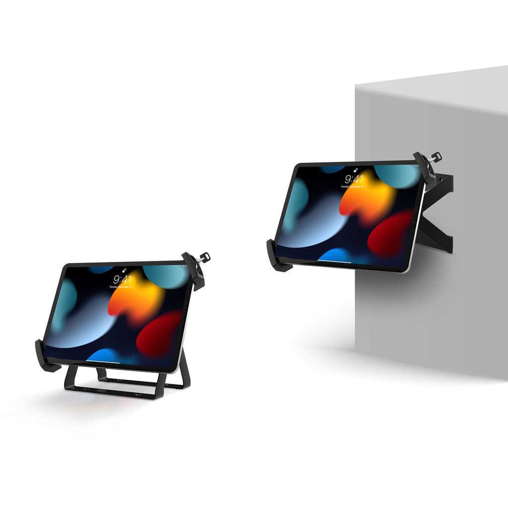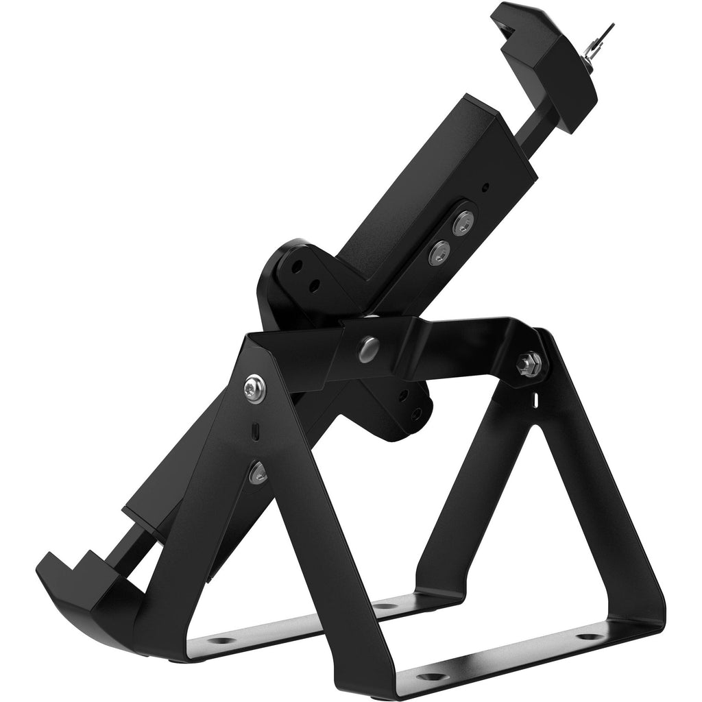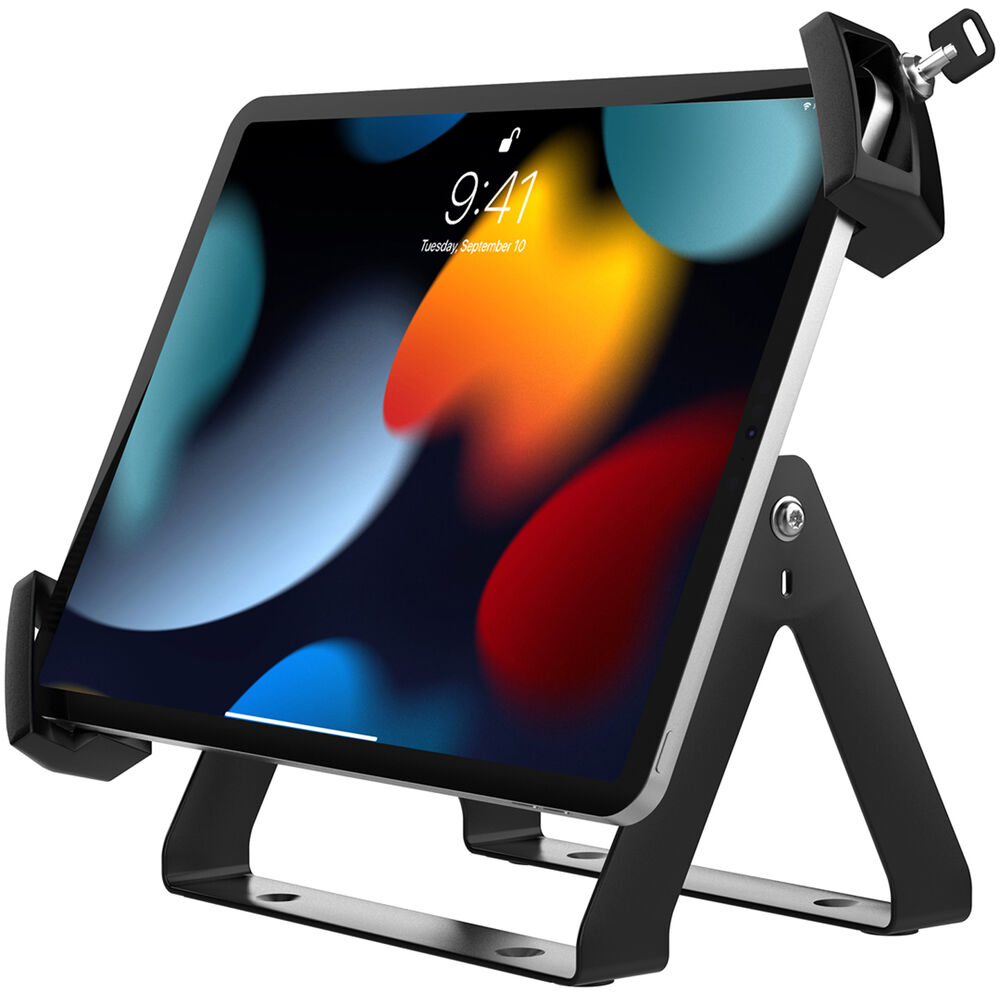The black CTA Digital Full Rotation Desk Mount with Universal Security Holder for 7.9 to 12.5" Tablets allows for secure two-person use of a tablet. The sturdy metal base can be permanently mounted to any horizontal surface via pre-drilled holes, but is also heavy enough for use even without screwing it down. The holder grips diagonal corners snugly in place with rubber grips. To insert a tablet, unlock the arms with the included key, adjust to fit, then lock in place. The holder rotates for use in either portrait or landscape orientation. A pre-drilled hole through the center of the mount allows the use of a Kensington Lock cable, available separately.