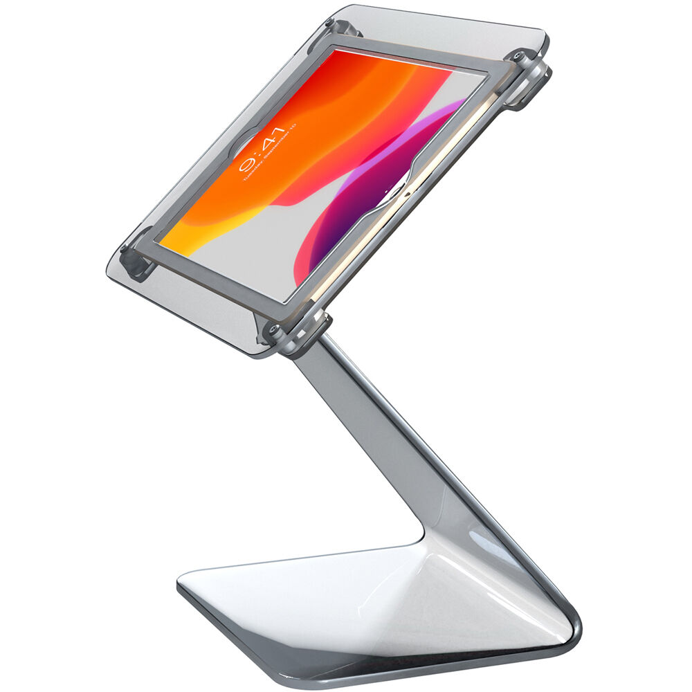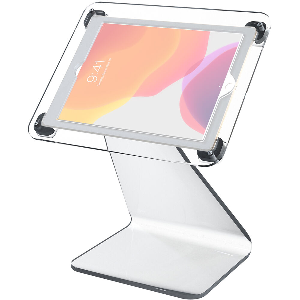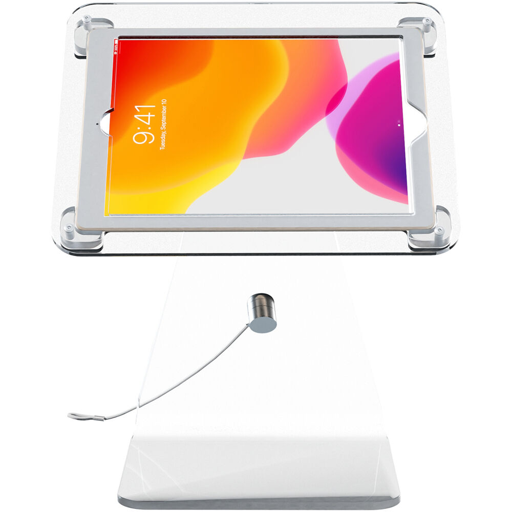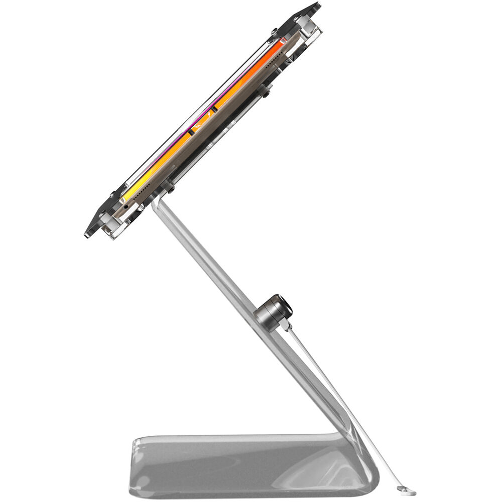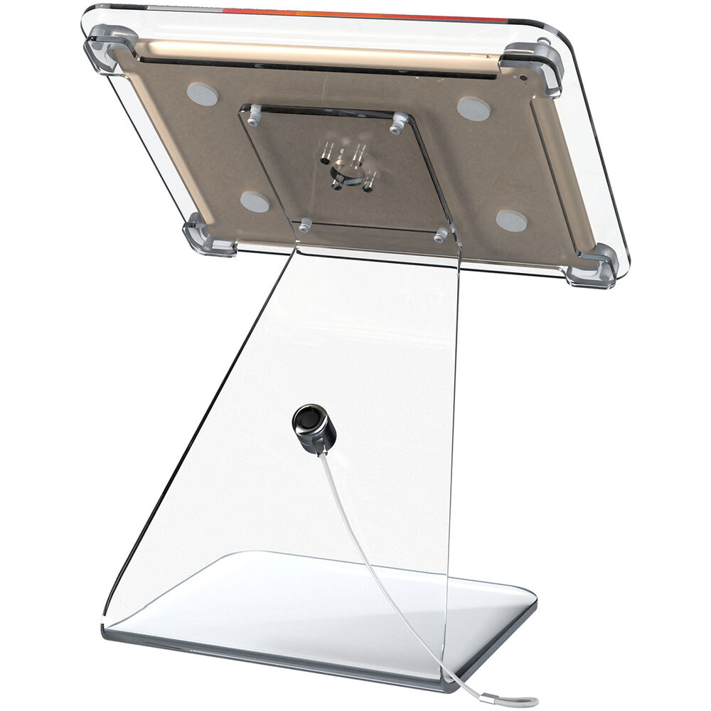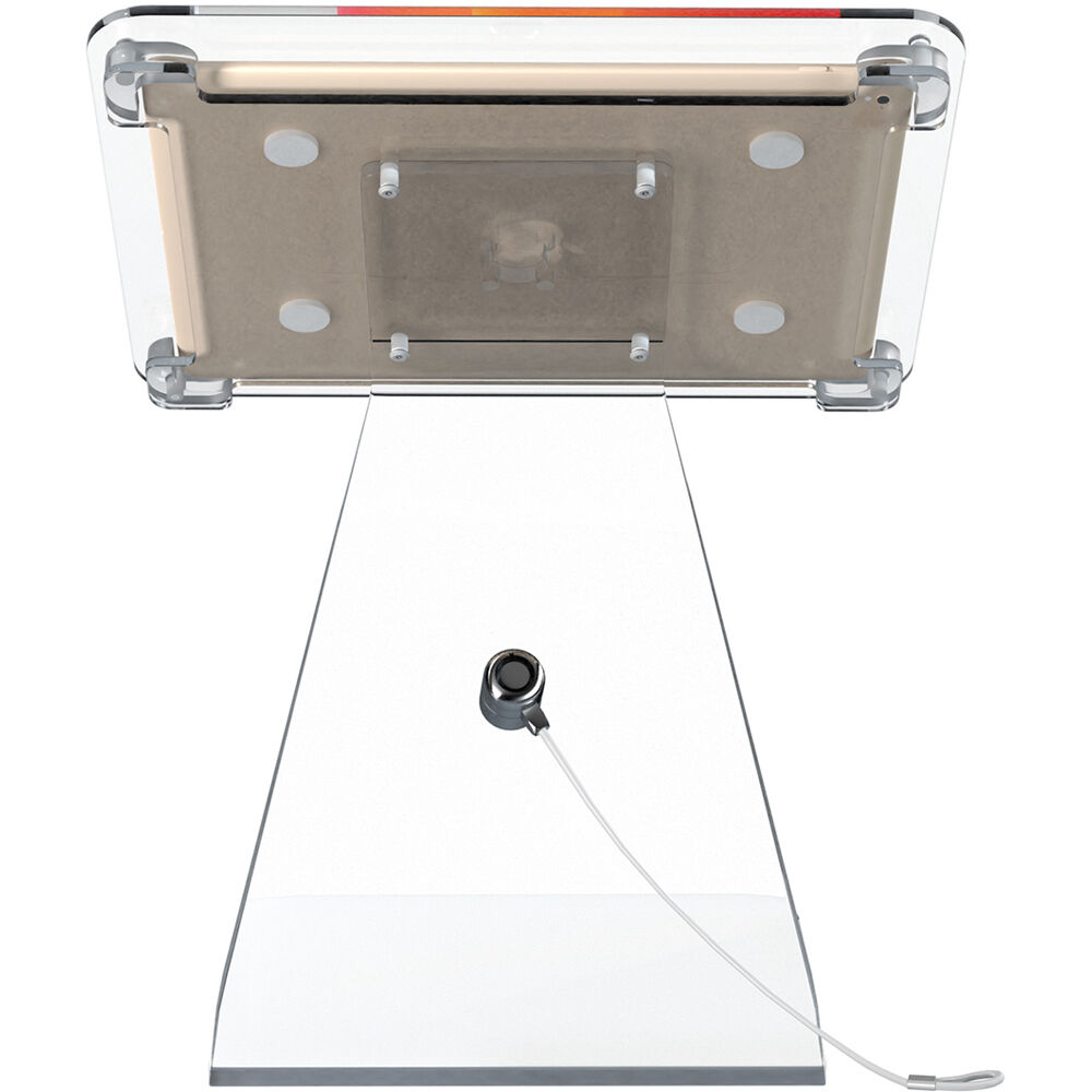 Display a tablet while keeping it secure with the Security Translucent Acrylic Kiosk from CTA Digital. Featuring a translucent acrylic stand and locking enclosure, this stand measures 13.25" tall. Front-to-back angle adjustment provides easy articulation, and cable routing at the back of the tablet holder keeps cords organized. Sporting scratch and slip resistant rubber pads on its base, the Security Translucent Acrylic Kiosk also comes with an optional steel security cable for securing the stand to a permanent fixture.