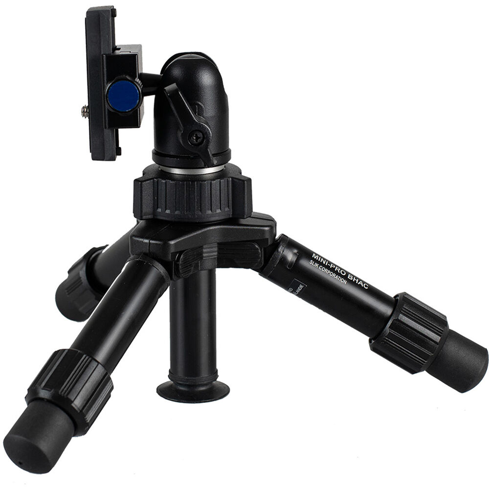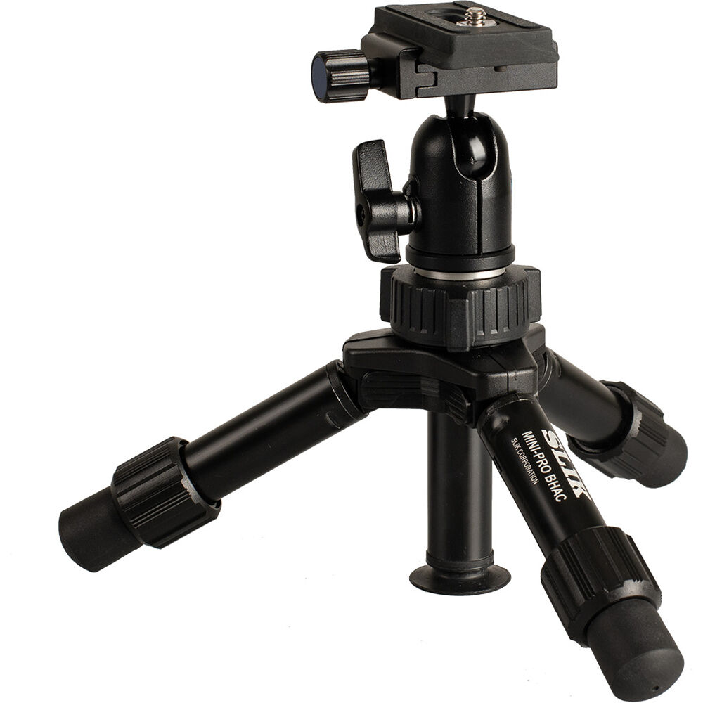 The Mini-Pro Tripod with SBH-100AC Ball Head from Slik is an ideal, versatile tabletop tripod and ball head combination for webcams, action cams, and mirrorless cameras weighing up to 2.2 pounds. With a weight of just 14.2oz and a folded height of 8 inches this tripod fits just about anywhere. The legs extend for added stability and height, and the center column also extends, for a maximum height of 9 inches.