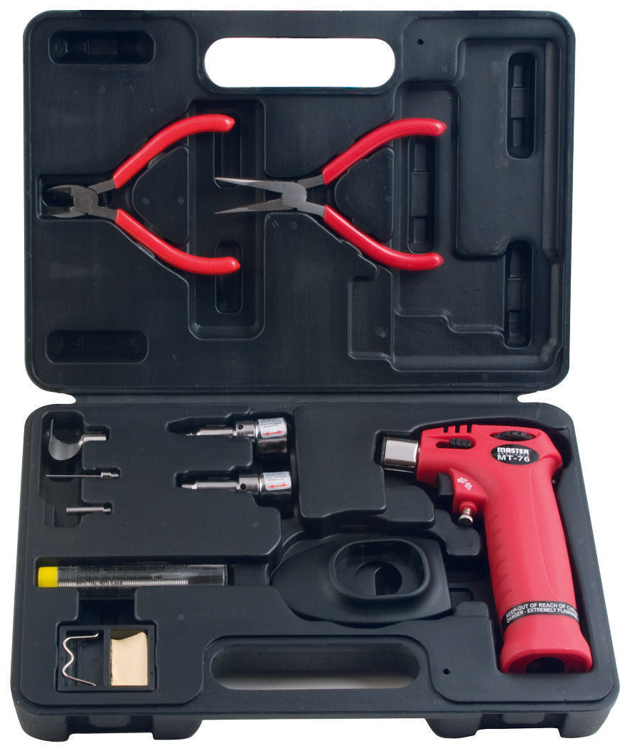 Kit Contents | Trigger Torch, Removable Stand, Cutter, Pliers, Solder Tip, Heat Tip, Shrink Attachment |
