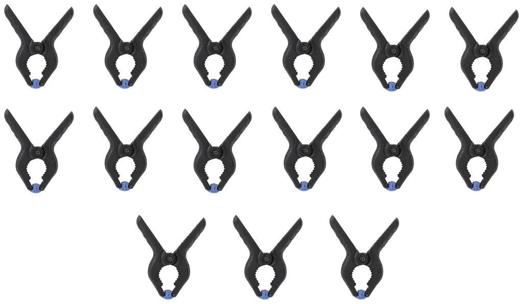 15-piece small nylon grip clamps set, suitable for flat and odd shaped objects with pivoting jaws for even pressure. All clamps are fitted with adjustable grips for better positioning and suitable for holding, gripping and clamping work pieces.
