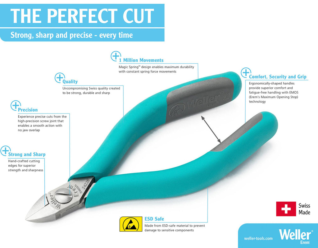Weller Erem® Cutters are designed to be strong, durable and sharp, having the highest precision available. Manufactured with uncompromising Swiss quality and created for worldwide applications, including electronics assembly and healthcare, Weller Erem Cutters are built to last. The signature high-performance cutters set the industry standard with features that include Weller Erem Magic Spring� providing over one million consistent, precise and accurate movements, High-Precision Screw Joint, and Maximum Opening Stop Technology. Feel the difference with Weller Erem® - the proven choice. Every time. The Weller Erem Series 500 Micro is a full range of medium sized, robust, precision cutters with a wide range of head shapes. The cutters are manufactured from high grade tool steel. The cutting edges are hardened to Rockwell 63-65 HRC. The precision cutters have a non-reflecting surface, are ESD safe and resharpable.