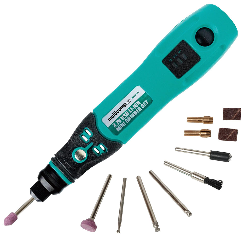This MP011887 compact Grinder set is crafted for tasks like grinding, sanding, shaping, detailing, and other tasks requiring light-duty work. Its USB charging capability ensures convenient usage at any location and time. With three adjustable speeds, it caters to various applications. Charging is facilitated through a Micro USB socket, while speed control is managed by a push-on trigger switch, offering freedom of movement.