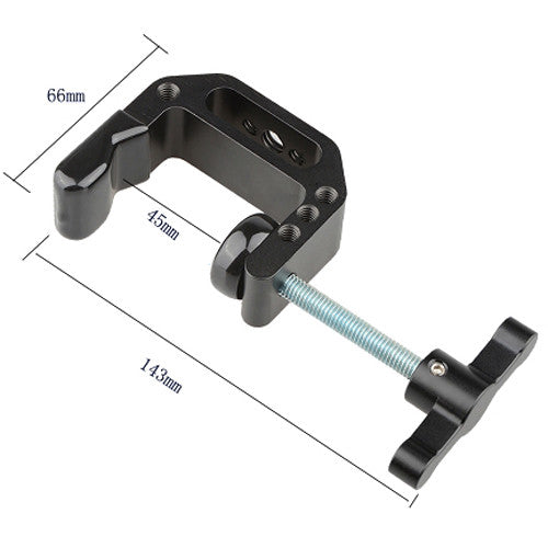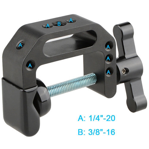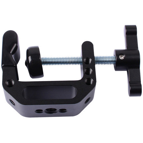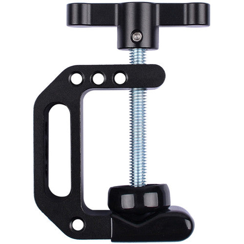 The C-Clamp from DigitalFoto Solution Limited features jaws that expand from 3 to 42mm. The incorporated single 3/8"-16 and eight 1/4"-20 threaded holes can be used to attach a monitor, smartphone, LED light, or video camera.
