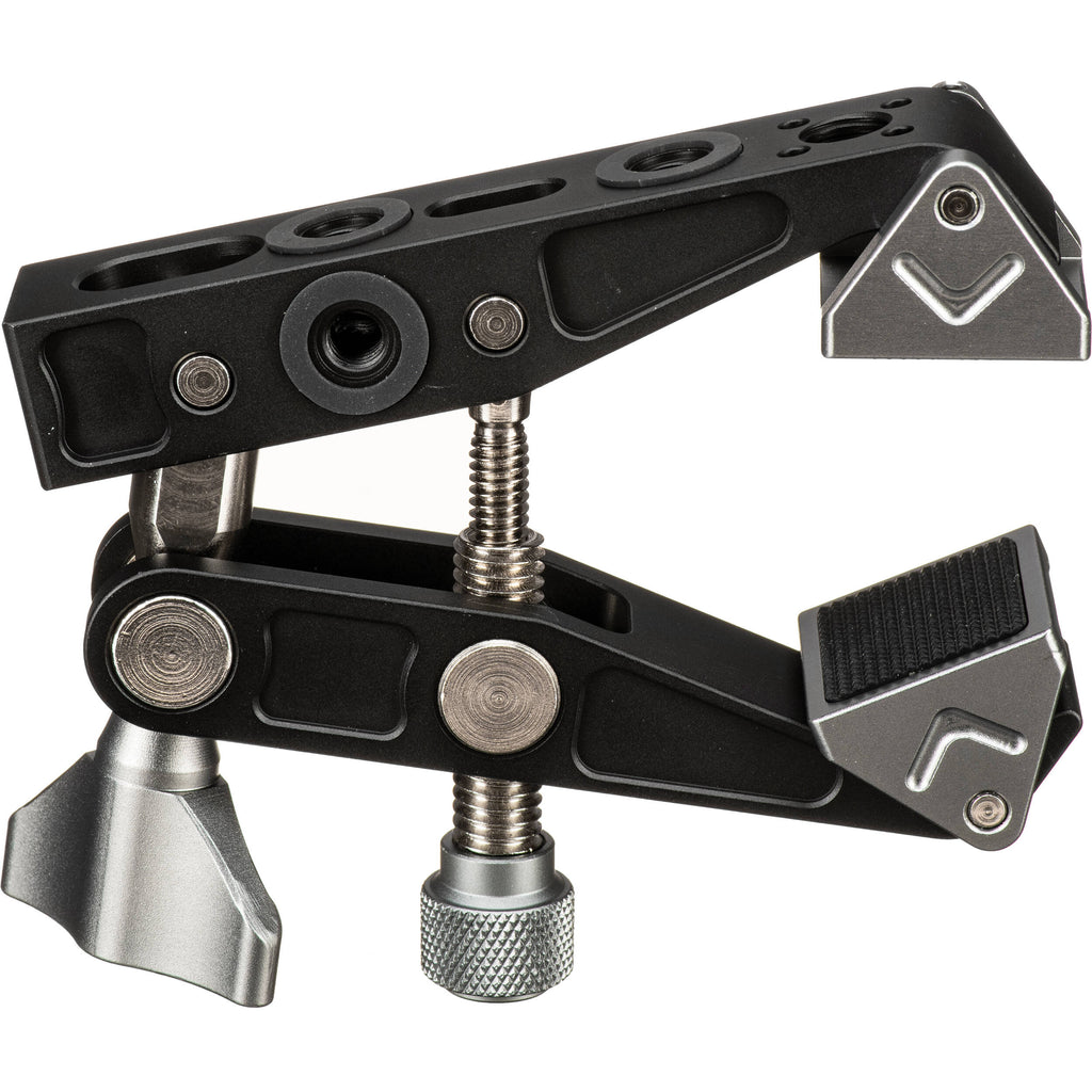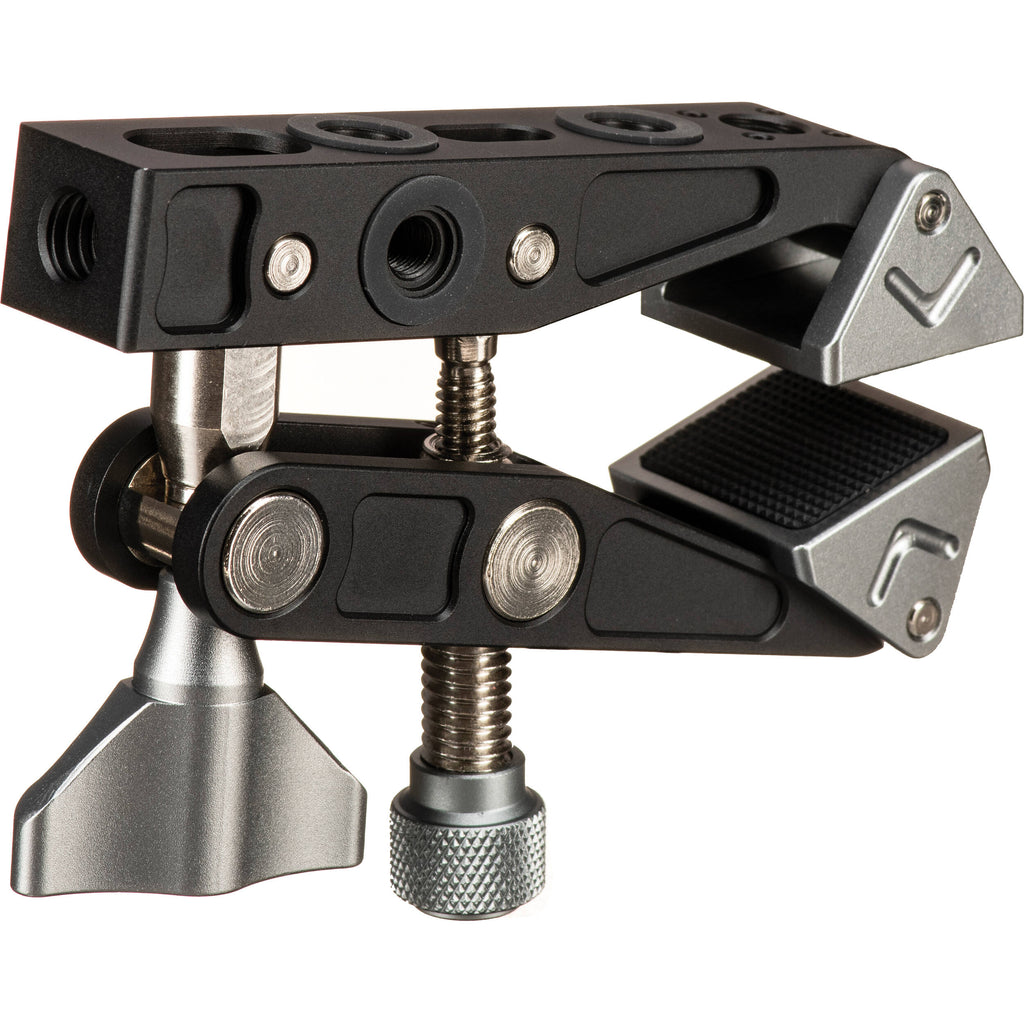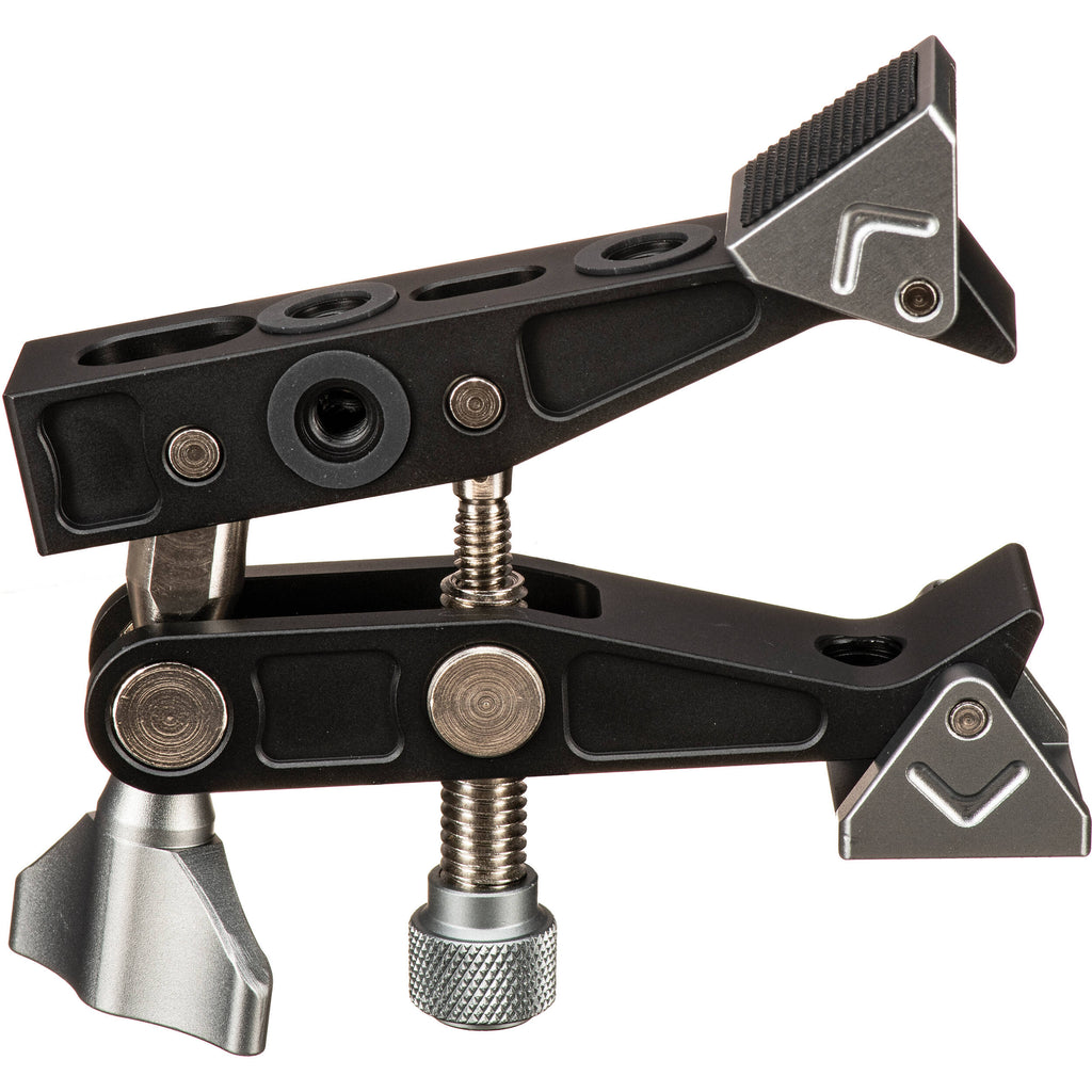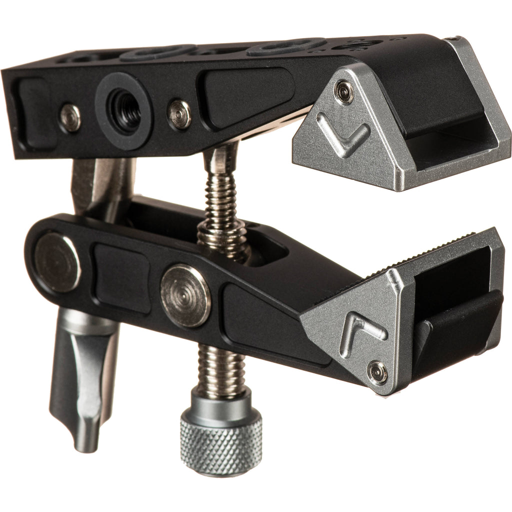 Clamp your camera, LED light, monitor, or other accessories to a nearby surface or cylinder with the DigitalFoto Solutions Limited Horseshoe Clamp. The clamp has integrated trapezoidal and triangular attachments that allow it to be utilized with both angular and smooth surfaces. The clamp's range�1 to 3.1" for cylinders and up to 2.4" for surfaces like tabletops�can easily be adjusted and locked into place. Four 1/4"-20 threads and three 3/8"-16 threads allow various accessories to be attached to the clamp.