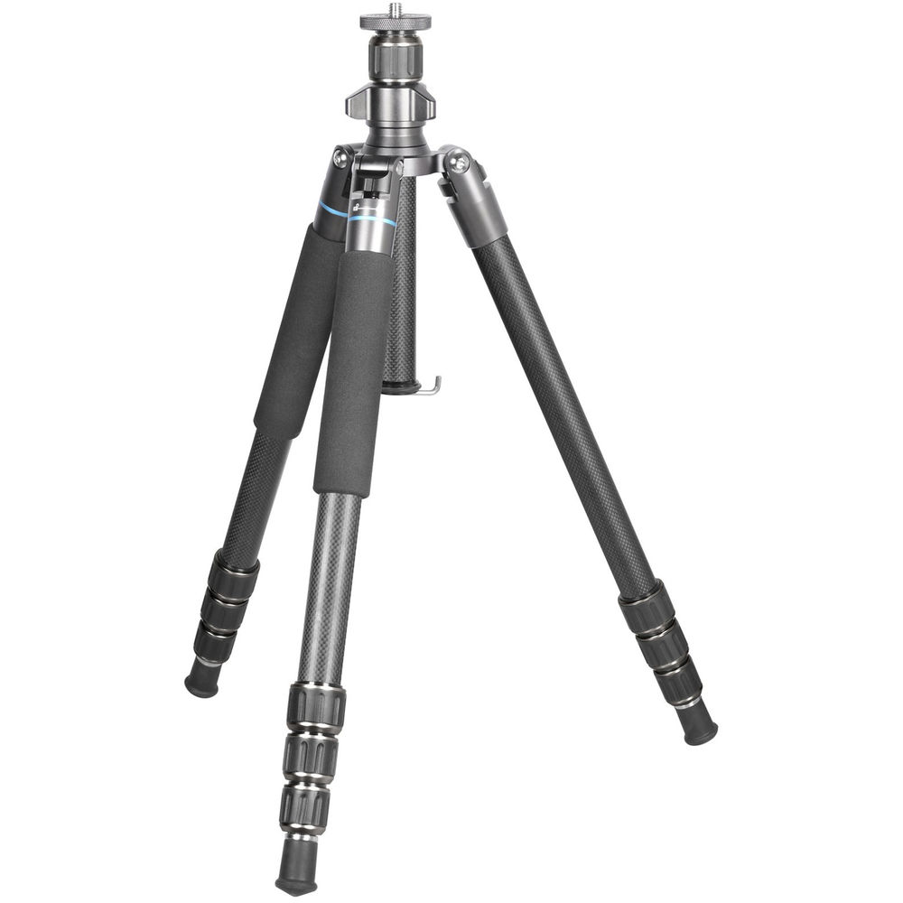 The FT-6229C carbon fiber ProMax Tripod from Field Optics Research is a lightweight support, weighing only 2.9 lb, that can hold optics weighing up to 35 lb. Its four-part telescoping legs with twist locks can extend up to 62.7" tall and shrink to just 9.5" short. The tripod is also portable, measuring only 17.9" tall when folded. Its center column is reversible and comes with an attached ballast hook for additional stability. Additionally, two legs are detachable and can be used as walking sticks or as monopods.