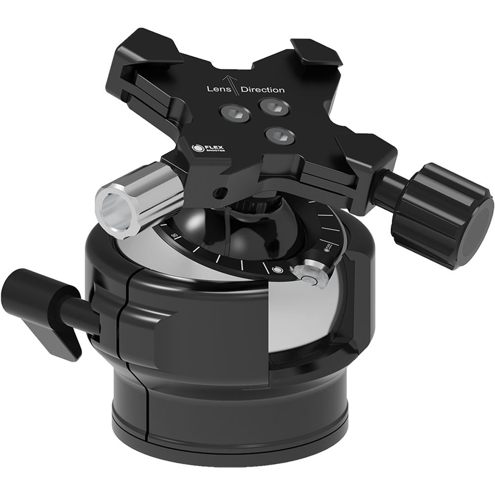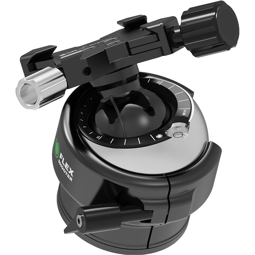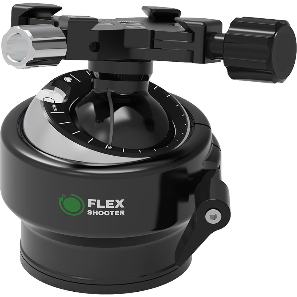 Designed for small to medium lens and camera combinations, the Pro Ball Head by FlexShooter features a patented double ball system, which unites three functions in one device. The inner ball operates as a two-axis head nestled inside the outer ball, which provides leveling and panning. The weight of your camera is balanced by the only spring balanced ball head design in the world. The patented spring balance design is incorporated in both balls for a gimbal-like range of movement without the risk of lens flop. Each ball provides tension and locks individually for precision control of your lens movement.
