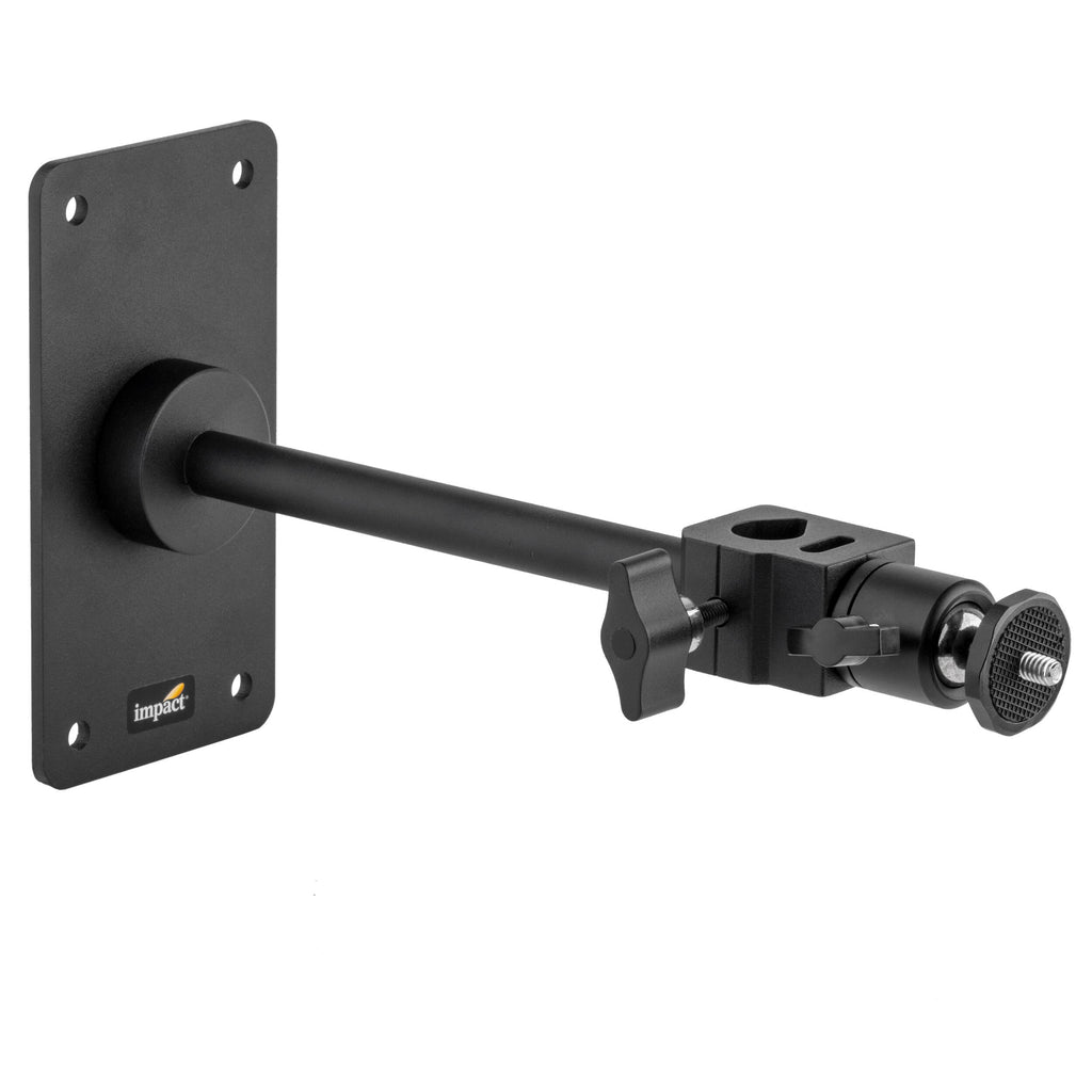 The BP-RA-MBH Right Angle Baby Wall Plate with Mini Ball Head from Impact provides the ability to mount a still camera, video camera, or security camera in a discreet location or at any required angle for a shoot. This sturdy all-metal baby plate will securely mount a camera or camcorder onto a wall or other similar flat surface. It features an 8" baby pin arm that can support a camera and lens combination weighing up to 6 lb. The baby plate features a mounting block that allows the camera's distance from the wall to be adjusted and rotated 360° around the pin. For positioning flexibility, the mounting block's two baby receivers provide the option of mounting it in-line or perpendicular to the baby pin. The camera angle may be precisely adjusted using the included mini ball head. The mounting block and ball head are removable for camera swapping or maintenance, and they also can mount onto any light stand baby-type 5/8" stud. By removing the mounting block and mini ball head, the BP-RA-MBH becomes a heavy-duty baby wall plate capable of supporting whatever load the user-chosen wall fasteners will hold, making it suitable for mounting LEDs, light fixtures, studio strobes, select grip heads, and more.
