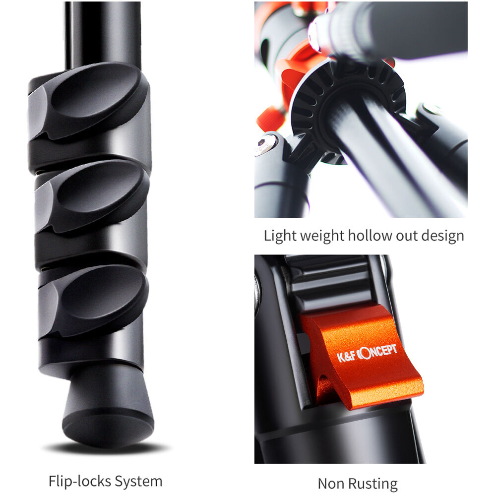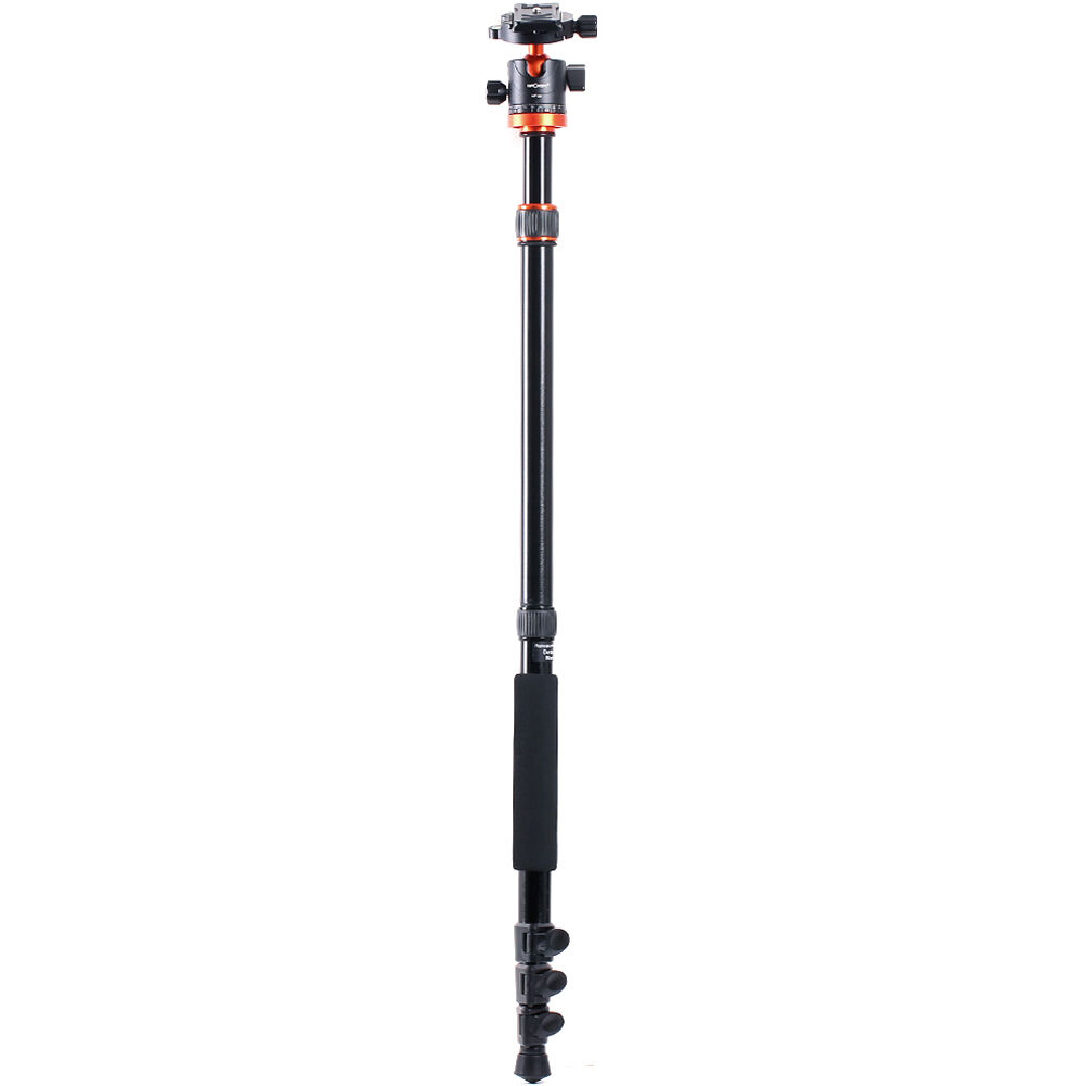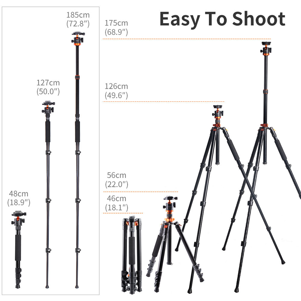 Load Capacity: 22 lbMaximum Height: 68.9"Minimum Height: 22"Folded Length: 18.1" The SA254M2 DSLR Camera Aluminum Tripod from K&F Concept is a lightweight travel tripod that is rich in the kind of features found in much larger tripods. The legs may be positioned independently to multiple angles for use on uneven terrain, and they open or close quickly with large flip locks. The legs may be inverted for ultra-low level shooting and reverse fully and fold to a travel-ready 18.1" length. For shoots where an even more compact support is called for a removable leg converts into a monopod, and the center column may be combined with it to form an full-sized tall monopod. The included tripod ball head incorporates an Arca-type quick release clamp and quick release plate set and features quick single knob release and an independent pan locking knob for panoramic imaging.