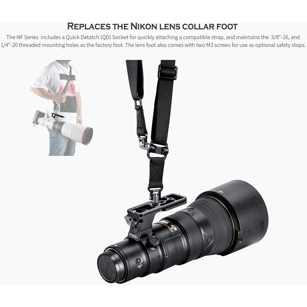 Aiming to improve on the default design, the Leofoto NF-01 is a collar foot for Nikon AF-S NIKKOR 70-200mm f/2.8E FL ED VR and AF-S NIKKOR 500mm f/5.6E PF ED VR. This is a meticulously engineered aluminum support with built-in Arca-type dovetail mounts featuring 1/4"-20 and 3/8"-16 receivers as well as a QD socket for quickly attaching a compatible strap or sling. Two M3 screws are included for use as optional safety stops.