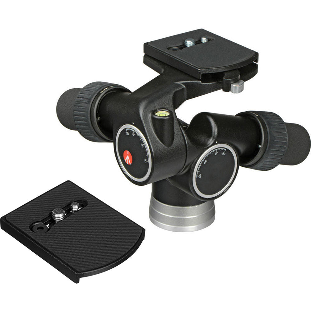 This B&H Kit includes the Manfrotto 405 Pro Digital Geared Head and a 410PL Quick Release Plate . Designed especially for DSLR and medium format camera shooters who need both speed & precision, the 405 Pro Digital Geared Head is a capable three-way head which features bubble levels that may be easily seen in two axes - no matter the orientation of the camera. Meaty rubberized knobs can either completely disengage the gear mechanism for a quick rough estimate of position or offer the finest exacting placement for even a macro shot. Cranks allow 360° pans and +90° to -30° of horizontal or lateral tilt.