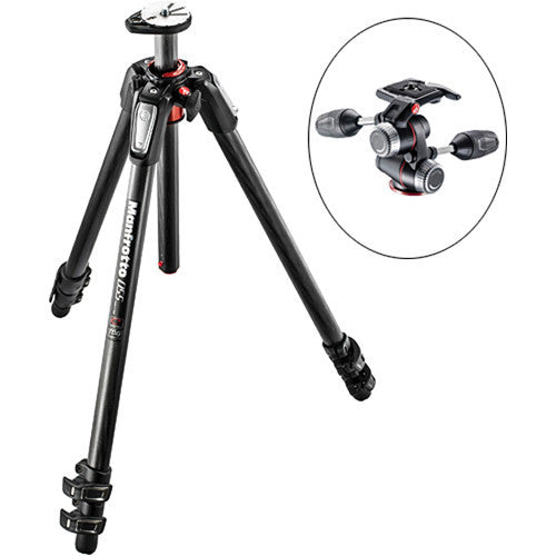 This B&H Kit pairs a MT055CXPRO3 Carbon Fiber Tripod with a MHXPRO-3W 3-Way Pan/Tilt Head. Holding up to 17.6 lb, and with a maximum height of 72", the tripod features a Quick Power Lock System that allows you to completely extend the legs with just one hand. Once set up you can use the MT055CXPRO3's rapid center column in standard vertical mode or swing it into horizontal position like a boom with Manfrotto's 90° column feature. Enlarged tabs on the individual leg angle selectors allow you to get down low for macro work with the column in horizontal mode. And once you're down there you can attach any of Manfrotto's flexible or articulated arms to hold lights or reflectors via the Easy Link plug built into the tripod's spider.