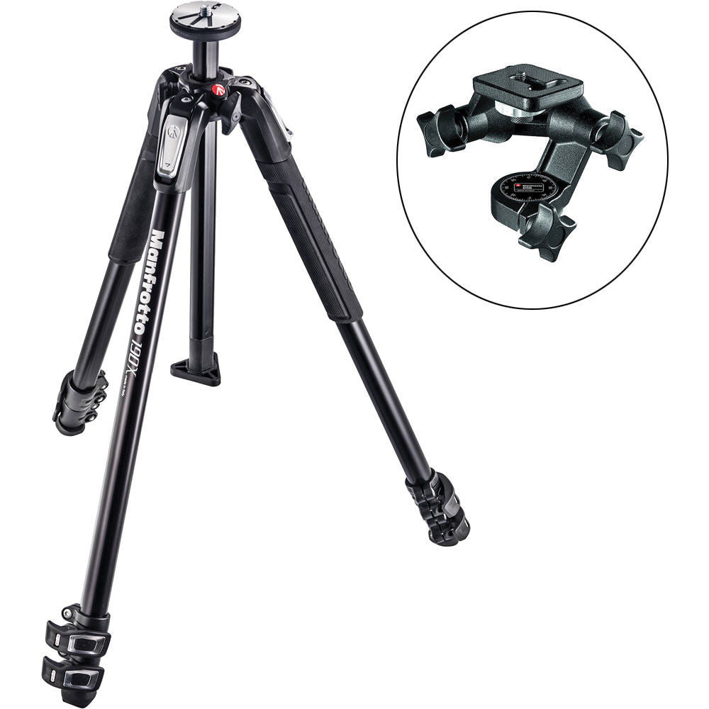 This kit from B&H Photo pairs the MT190X3 Aluminum Tripod with the 056 3-D Junior Pan/Tilt Head . The tripod features a Quick Power Lock System, ground level adapter, and an Easy Link attachment. It can hold up to 6.6 lb of gear, and has a maximum height of 67". The ground-level adapter replaces the center column to allow the tripod's mounting plate to sit just 7.5" above the ground with the legs at their widest angle.