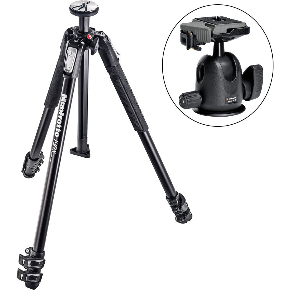 This kit from B&H Photo pairs the MT190X3 Aluminum Tripod with the 496RC2 Compact Ball Head . The tripod features a Quick Power Lock System, ground level adapter, and an Easy Link attachment. It can hold up to 13.2 lb of gear, and has a maximum height of 66.9". The ground-level adapter replaces the center column to allow the tripod's mounting plate to sit just 7.4" above the ground with the legs at their widest angle.