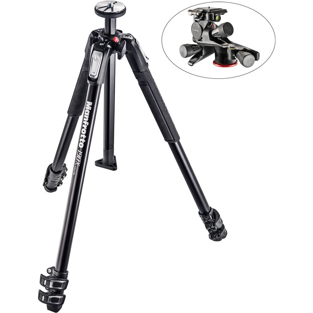 The MT190X3 Aluminum Tripod with XPRO Geared 3-Way Pan/Tilt Head Kit from Manfrotto is an addition to the popular 190 series. The tripod legs included in this kit add a Quick Power Lock System, ground level adapter, and an Easy Link attachment. It can hold up to 8.8 lb of gear, and has a maximum height of 68.1". The ground-level adapter replaces the center column to allow the tripod's mounting plate to sit just 8.6" above the ground with the legs at their widest angle.
