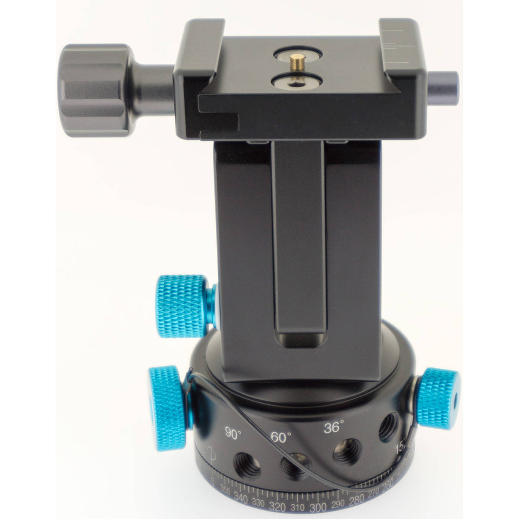 The R1 top piece has the ability to tilt between -15, -10, -7.5, -2.5, 0, +5, +7.5, and +12.5°; the R10 rotator has 10, 15, 36, 60, and 90° detent options to create the panoramas. You can also upgrade the rotator to a dual-plunger option to hold lenses up to 200mm. The built-in bubble level ensures your horizons are straight as you shoot your images.