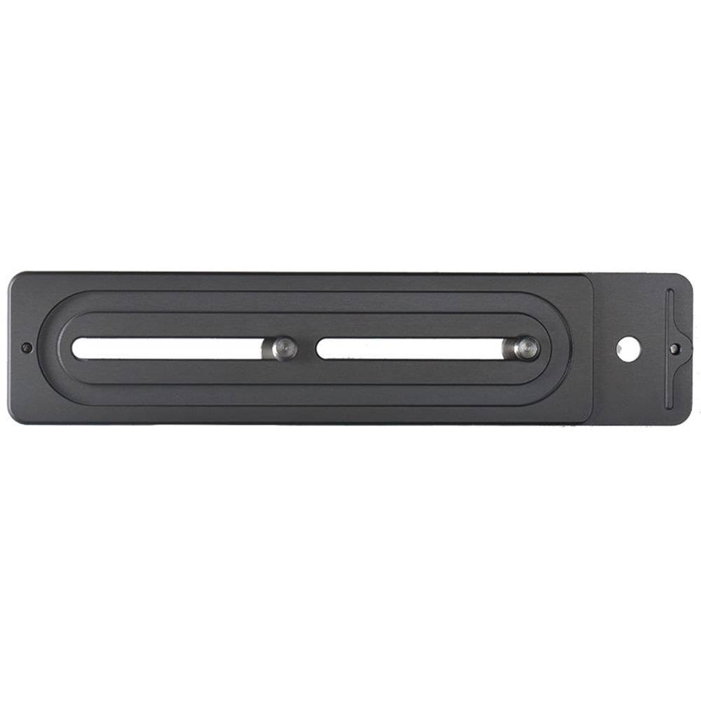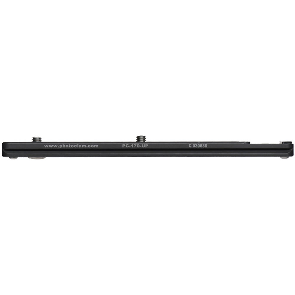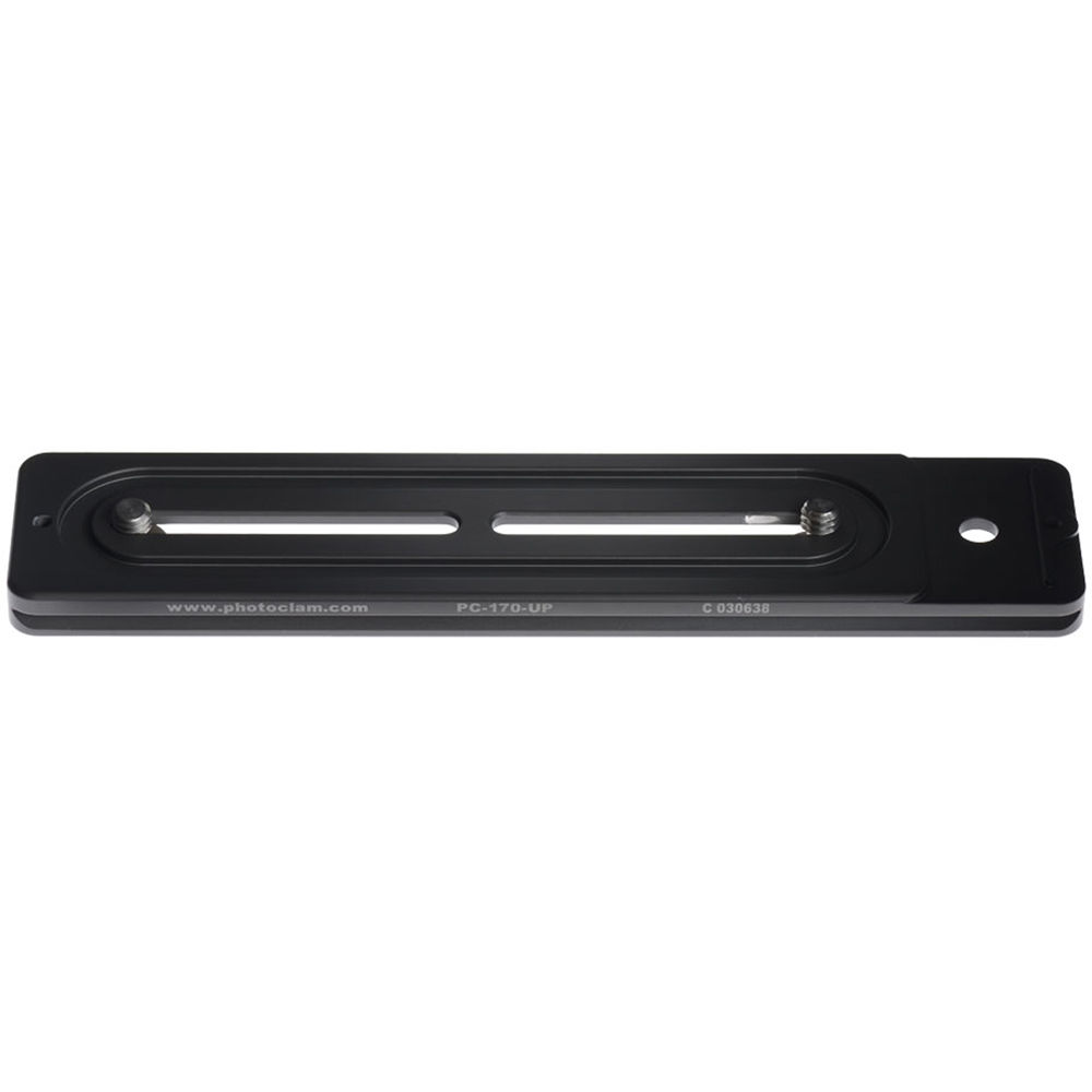 The 6.7" long PC-170-UP Universal Lens Plate from Photo Clam is an Arca-type plate with two 1/4"-20 threaded mounts. The aluminum plate has a padded rubberized top that prevents the mounted lens from moving while attached to the plate. Additionally, strap loops machined on each side of the plate allow a shoulder strap to be attached.
