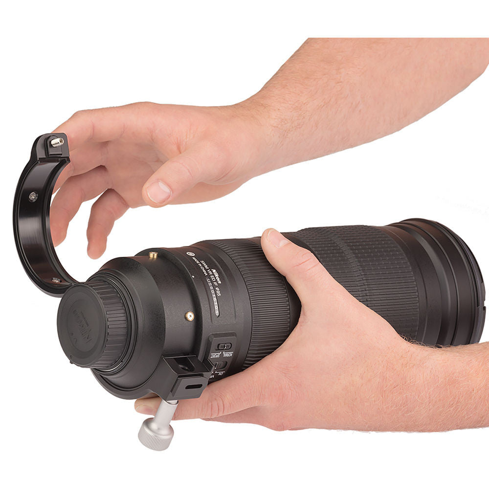 The Really Right Stuff Collar Foot Package for Nikon AF-S 200-500mm f/5.6E ED VR Lens replaces the original manufacturer's collar and foot. This replacement lowers the height of the lens and gives more support and stability when rotating the lens within the collar. This accessory also adds a double dovetail design to the foot, which is compatible with all Arca-type clamps. With a double dovetail, other Arca-type accessories can also clamp on top of the tripod foot.