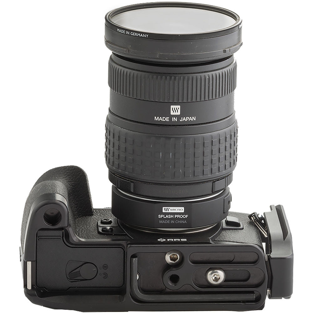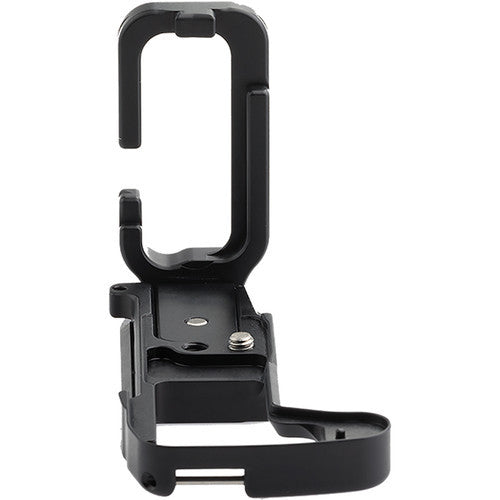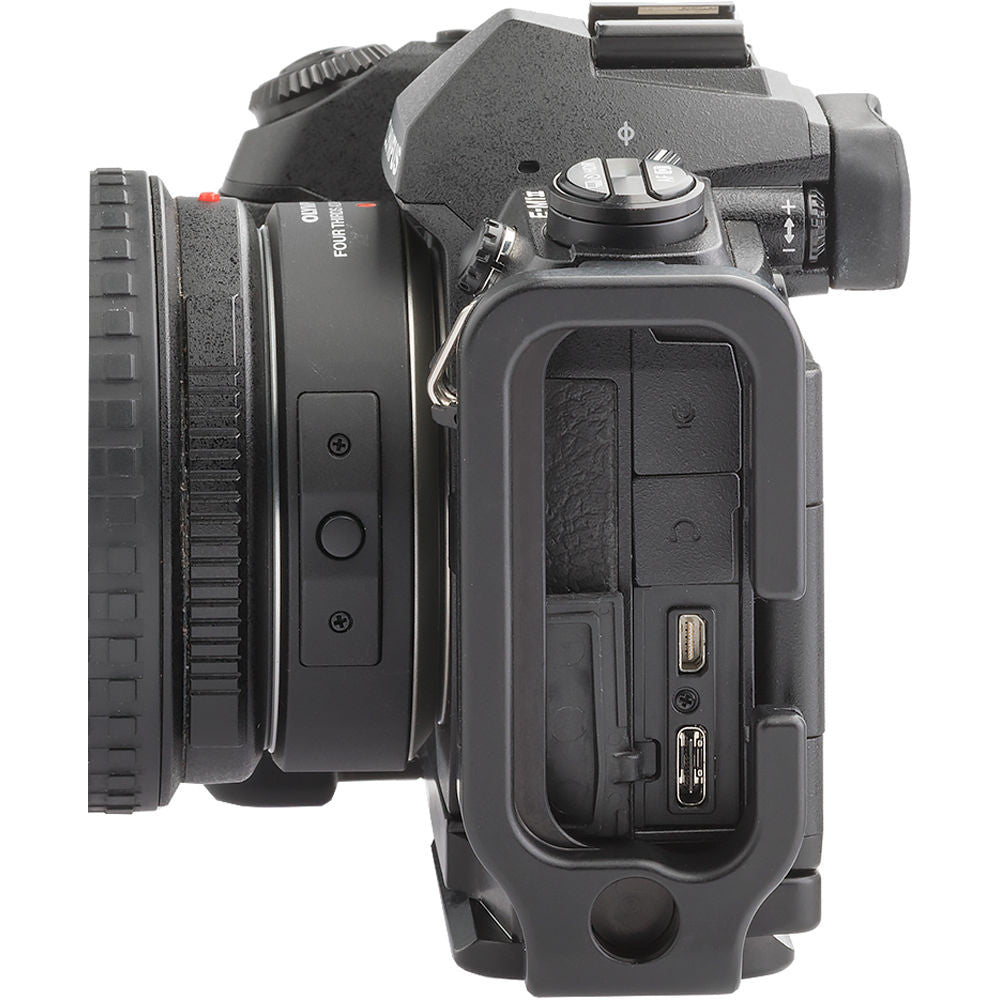 The L-plate maintains complete access to the battery door and the camera's ports. Both parts can be separated slightly, and retightened with the included hex key if more room is needed for your tethering or cable release. Furthermore, there is no obstruction to the movement of the LCD monitor on the camera. In addition, a boss has been machined into the side of the plate, so an accessory hand or shoulder strap can fit.