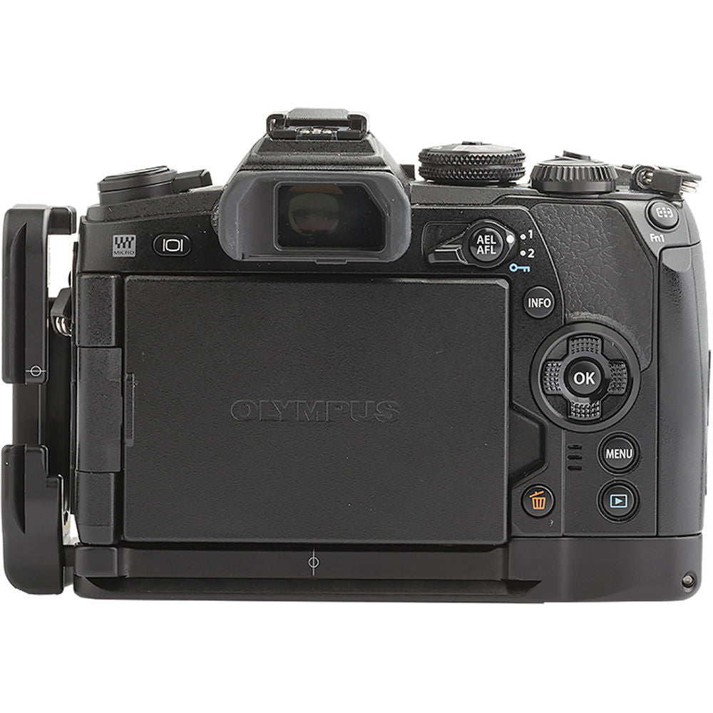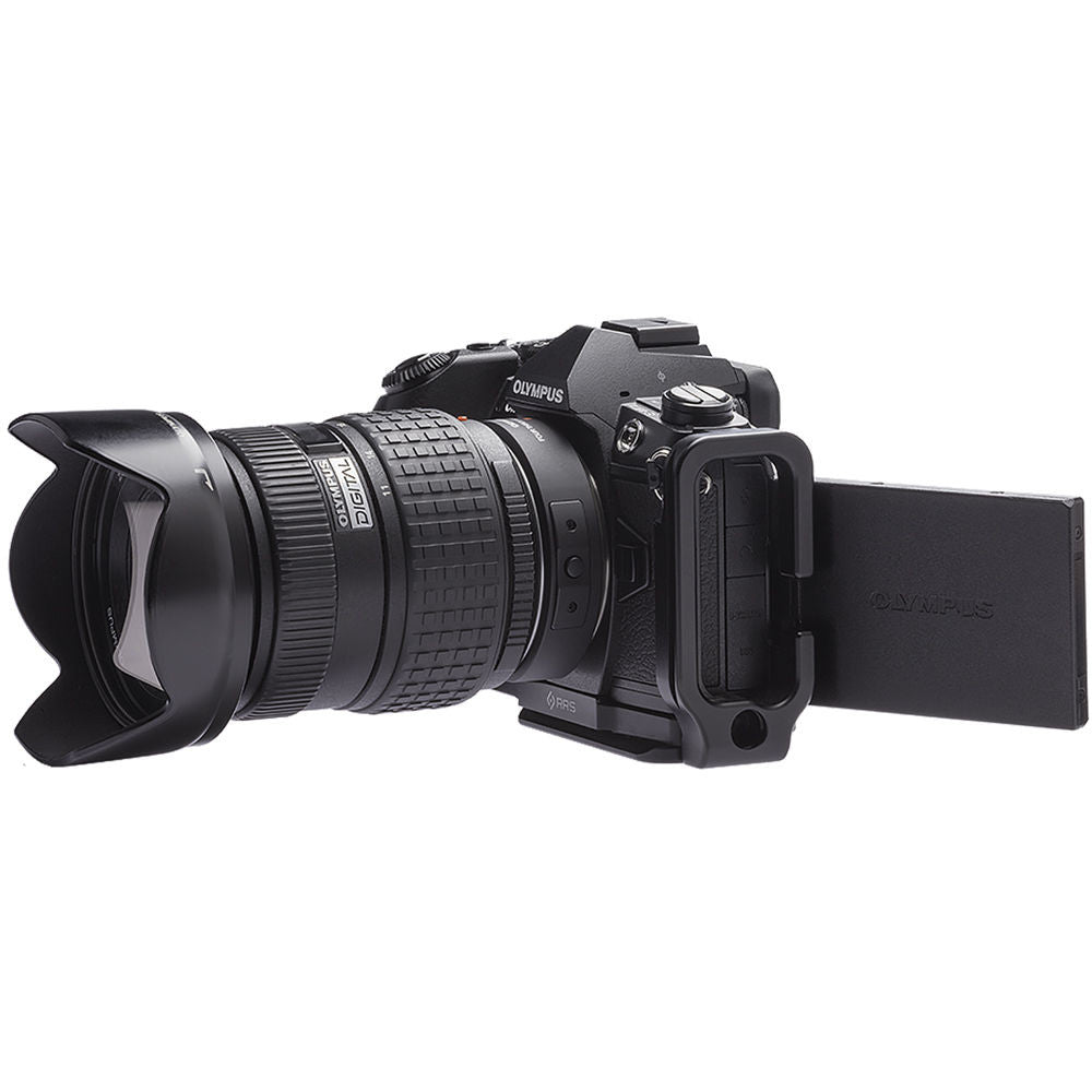 The L-Plate Set for Olympus OM-D E-M1 Mark II from Really Right Stuff is a modular design composed of a base plate and an L-component. Both parts create an L-plate, which can be changed while on top of a tripod, from a vertical to a horizontal position without sacrificing your center of axis. The Arca-type compatible dovetail plate adds quick release functionality to the camera, and there is a magnetic storage spot for the included hex key.