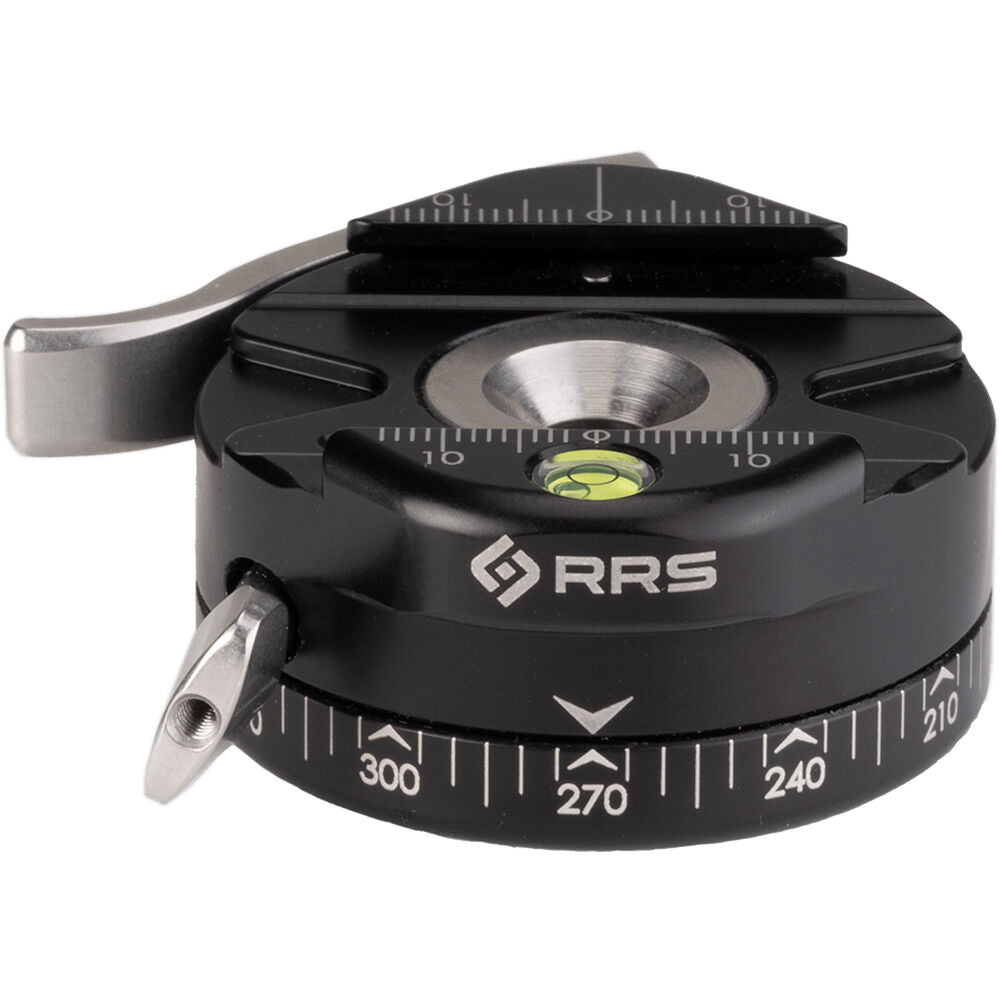 The panning clamp has precision laser engravings for panning angle and camera position, and an integrated 8mm bubble level makes leveling quick and easy. The PC-LR-40 features a built-in R-Mount, allowing you to rigidly mount it onto any Really Right Stuff ball head stem. This allows using the ball head to level the panning axis, eliminating the need for a leveling base in many applications. The increased speed and accuracy offered by the panning clamp makes setup for single-row panoramas a snap.