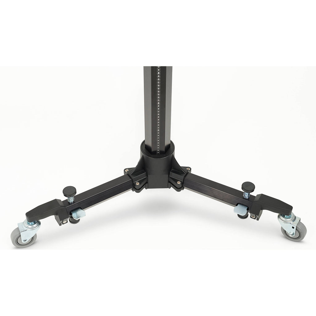 The second version 01-360-MK2 Commercial Studio Camera Stand from Studio Titan America is designed for commercial photography and optical measurement systems and can be used in a studio setting for portraiture, food, or product photography. The center column features and internal counterweight, allowing the camera platform to smoothly position a load of up to 15.4 lb on both the Z- and Y-axis using one-handed operation. Camera platform elevation has a maximum working height of 70.86", a minimum working height of 19.7", and a horizontal arm width of 21.6". The camera platform can mount a tripod head and camera on one side and an optional computer shelf for a laptop on the opposite side, and it locks in position with a large brake knob. The studio stand's weighted base has a low center of gravity and three swiveling polyurethane casters, allowing the stand to be easily moved, and a set of foot-brake plungers on the left and right legs provide a quick set-and-release brake system.
