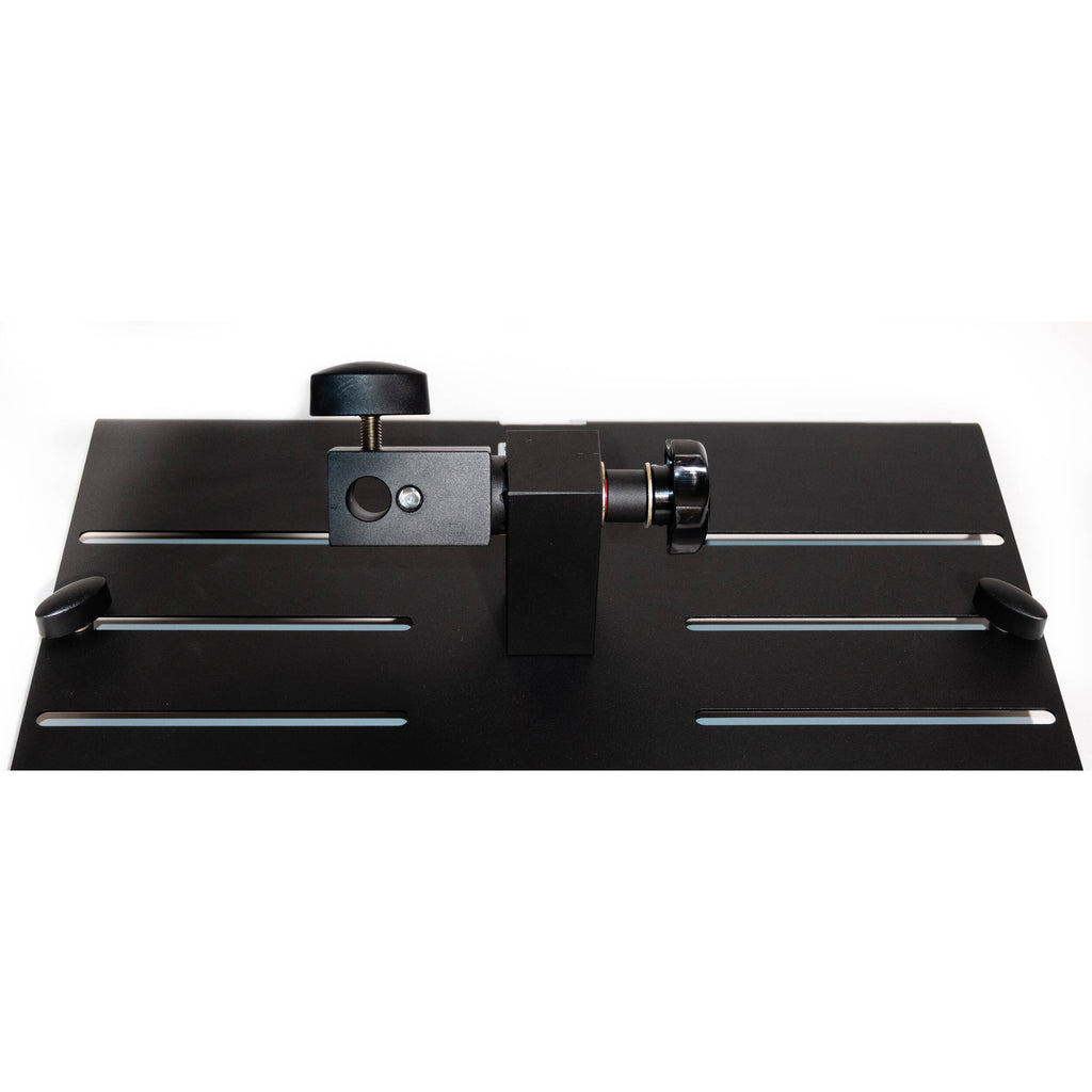 The Studio Camera Stand Small Accessory Shelf from Studio Titan America is a rugged powder-coated steel platform designed for use with iPad Pro tablets up to 12.9" and MacBook Pro 13 and 15" models. The Accessory Shelf features an adjustable knob for easy angle adjustment. Conical securing clamps can be re-positioned in one of the three clamp slots to prevent obstruction of a port or power connection. The clamp slots also provide increased ventilation, allowing your system to operate optimally reducing the risk of overheating during a shoot.